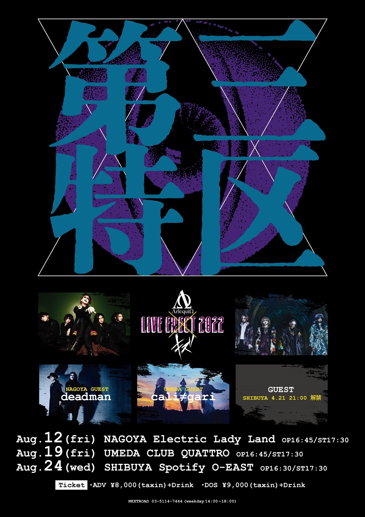 アルルカンとキズが、8月に2マンツアー『九命』、そしてゲストアーティストを招いて東京、大阪、名古屋で『第三特区』と題したイベントの同時開催を発表。先日、その第一弾ゲストアーティストとしてdeadmanが告知されていたが、本日4月14日、『第三特区』の 8月19日(金)梅田CLUB QUATTROのゲストアーティストとしてcali≠gariを発表した。