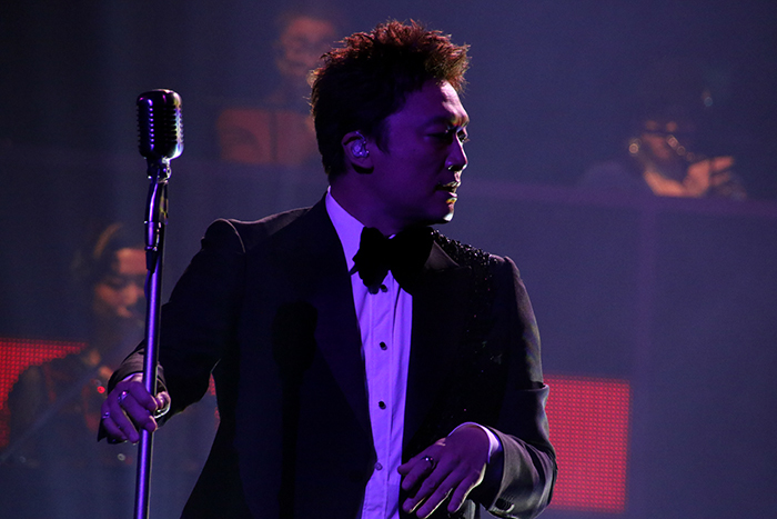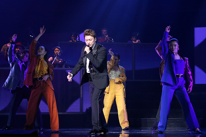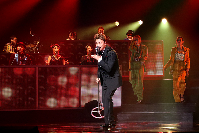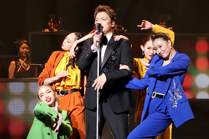 客席では開幕前からジャズが流れており、これから始まる公演への期待を高めてくれる。幕が開くとドラムのソロからスタート。ドラムが奏でるビートにコントラバス、ギター、サックス……とビッグバンドのメンバーが次々に加わっていく。コーラスのメンバーやダンサーたちも揃ったところで、アルバムのコンセプト通り、バッチリ決まったタキシードに身を包んで佇んでいた香取が客席に向き直る。14名のビッグバンドとカラフルな衣装に身を包んだダンサーたちの中央で、黒いタキシードを着て凛と立つ香取の姿は圧巻。冒頭からクールでお洒落な演出に期待が高まり、この公演の世界にぐっと引き込まれる。