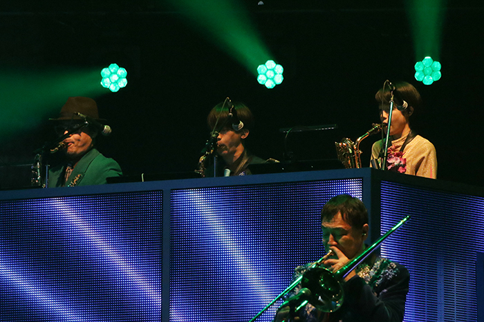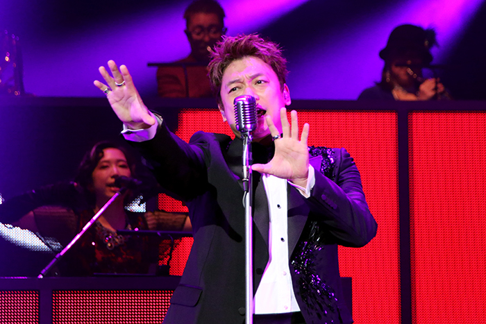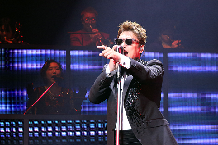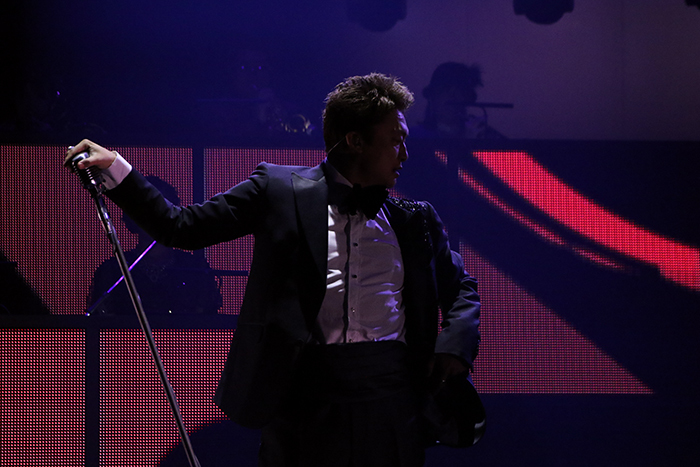 まずはアルバム名と今回のタイトルにもなっている「東京SNG」。ジャジーな曲をバンドの迫力ある生演奏で味わえるのが贅沢だ。香取はどこか懐かしさを感じさせる歌詞を、フェイクを混じえてパワフルに歌いこなしてオープニングを盛り上げる。シックなタキシードとやんちゃな表情や歌唱のギャップも魅力的。