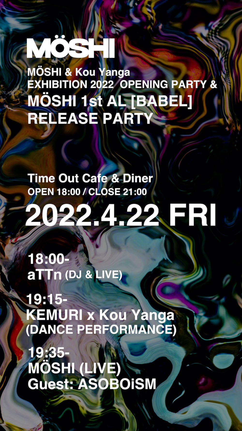 また、4月22日(金)から3日間にわたり、同胞であるファッションデザイナー・Kou Yangaと共にMÖSHIの最新アパレルコレクションのエキシビションをLIQUIDROOM内にあるギャラリーKATAにて入場無料で開催。会場ではMÖSHがデザインした初のアパレルグッズが数量限定で販売される。