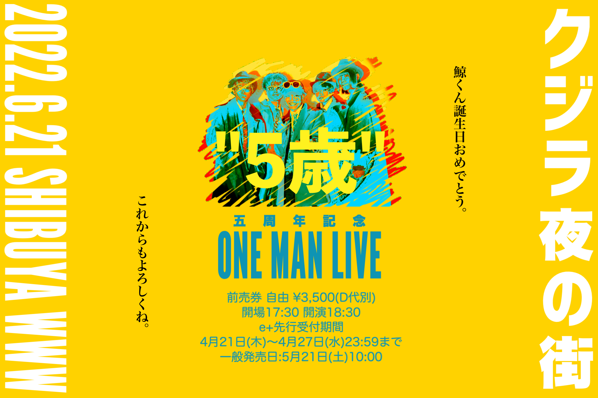 クジラ夜の街が、高校1年生でのバンド結成から5周年の節目を迎える6月21日(火)結成記念日に『クジラ夜の街ワンマンLIVE “5歳”』を開催することを発表した。