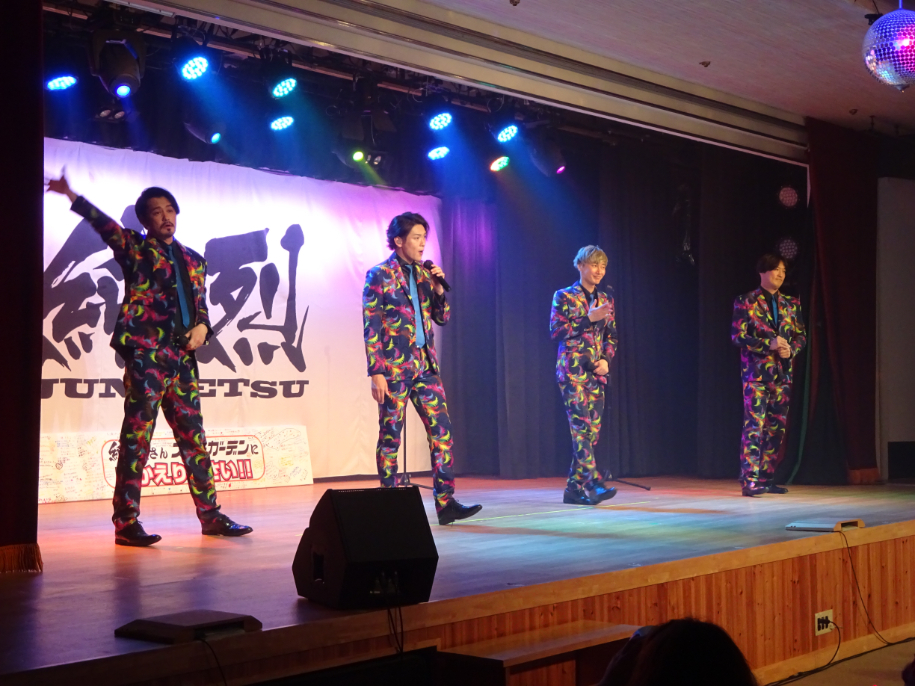 続いて、しっとりとしたメッセージソング「君を奪い去りたい」Aタイプのカップリング曲「来た道行く道」、映画『スーパー戦闘 純烈ジャー』のエンディング曲「心のままに」と続け、久しぶりの再会を果たしたファンと心を通わせあった。