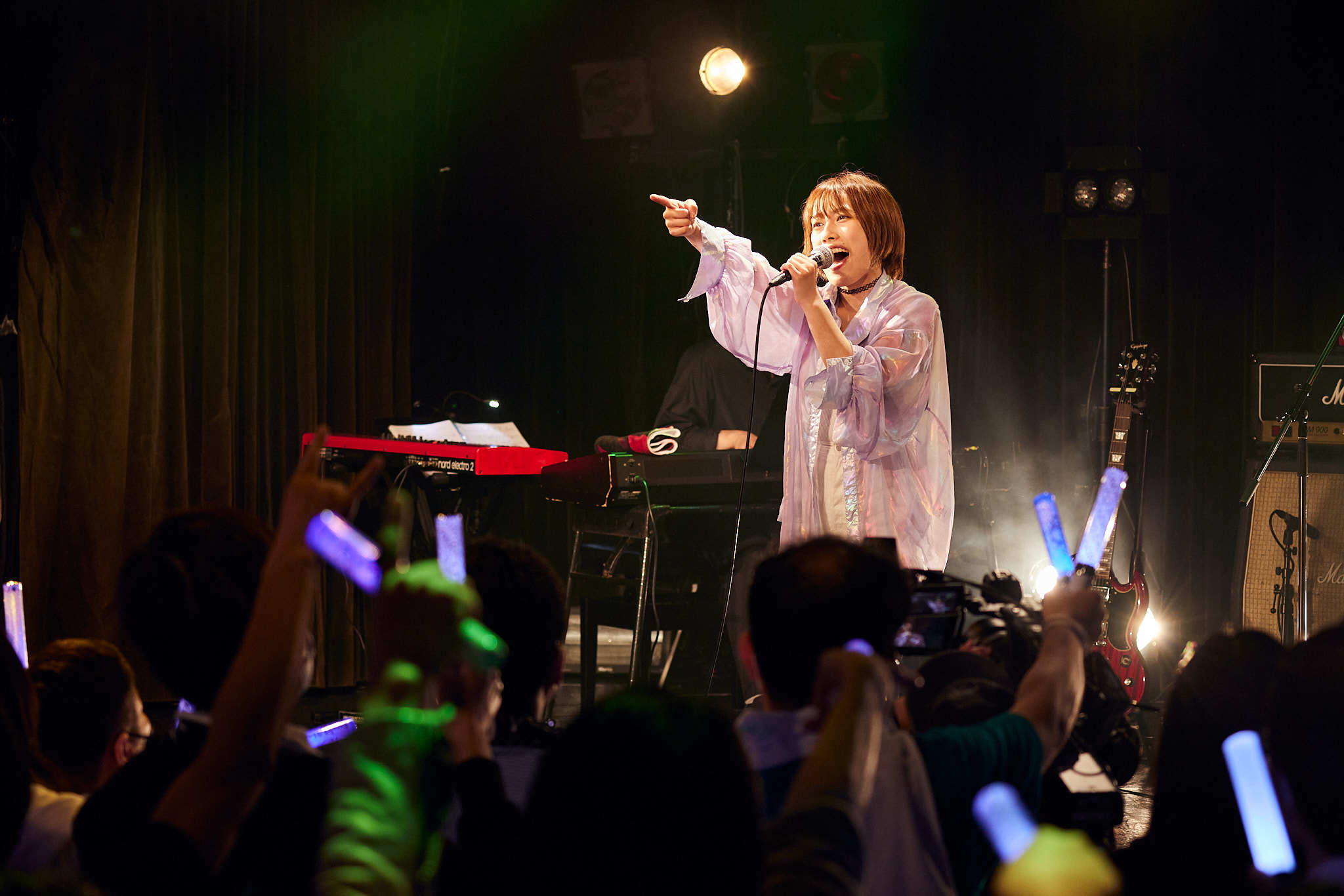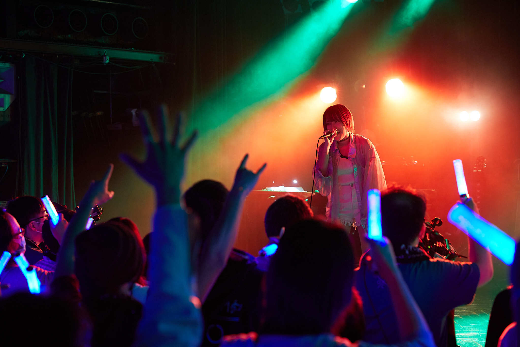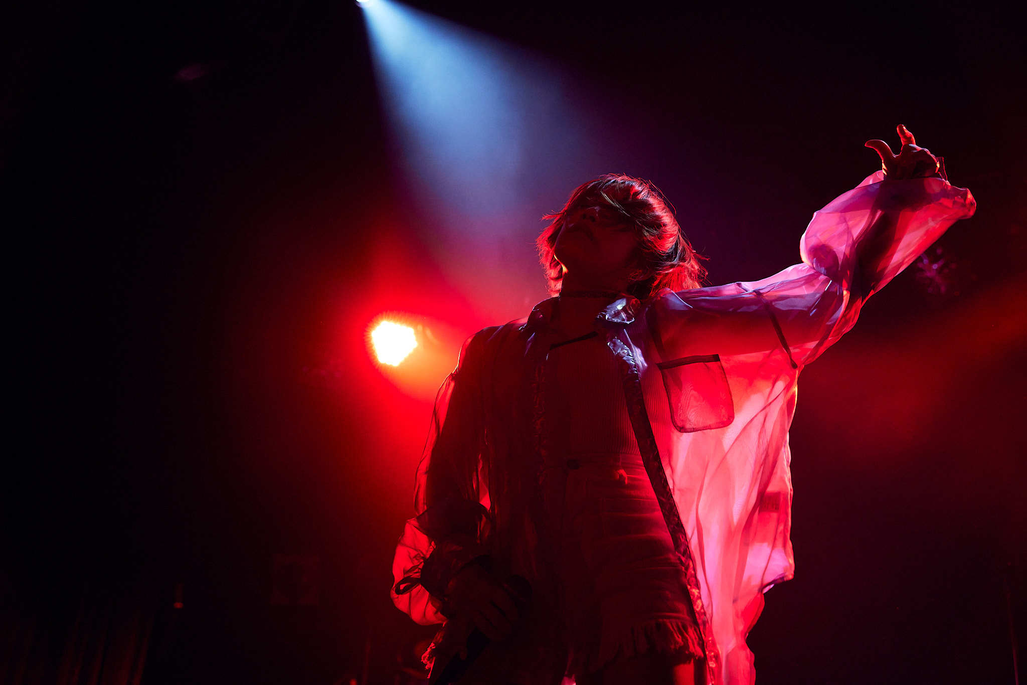 会場が暗転すると青白い光と逆光の中で「When I…」を歌い出し、ライブが幕を開ける。今回のライブはタイトルにもあるがROCK曲オンリー公演という自身初の試みでの公演。“BREAK!!”というタイトルの通り、自分自身の殻を破るという意味も込められており、全身全霊で歌い抜き会場を盛り上げていく。「今日は一緒に楽しんでいくよ!」の声と共に「Recollections」を歌い出し、続けて「まだまだ皆行けるよね?今日は“BREAK‼”だよ!」と煽り「FLAMING」を歌唱、自身初出演であるアニメ『美少女遊戯ユニットクレーンゲール』よりオープニングテーマ「ドリームクライマー」、アニメ『痛いのは嫌なので防御力に極振りしたいと思います。』のエンディングテーマ「Play the world」、女子プロレス共闘組織「Women’s Pro-wrestling Assemble」の応援ソングにもなった「Under the Flag」を立て続けに披露し観客のボルテージは上昇。ライブ前半から飛ばしていく姿に客席の熱量も高まっていくのを表すようにペンライトと拳が会場を力強く埋め尽くした。