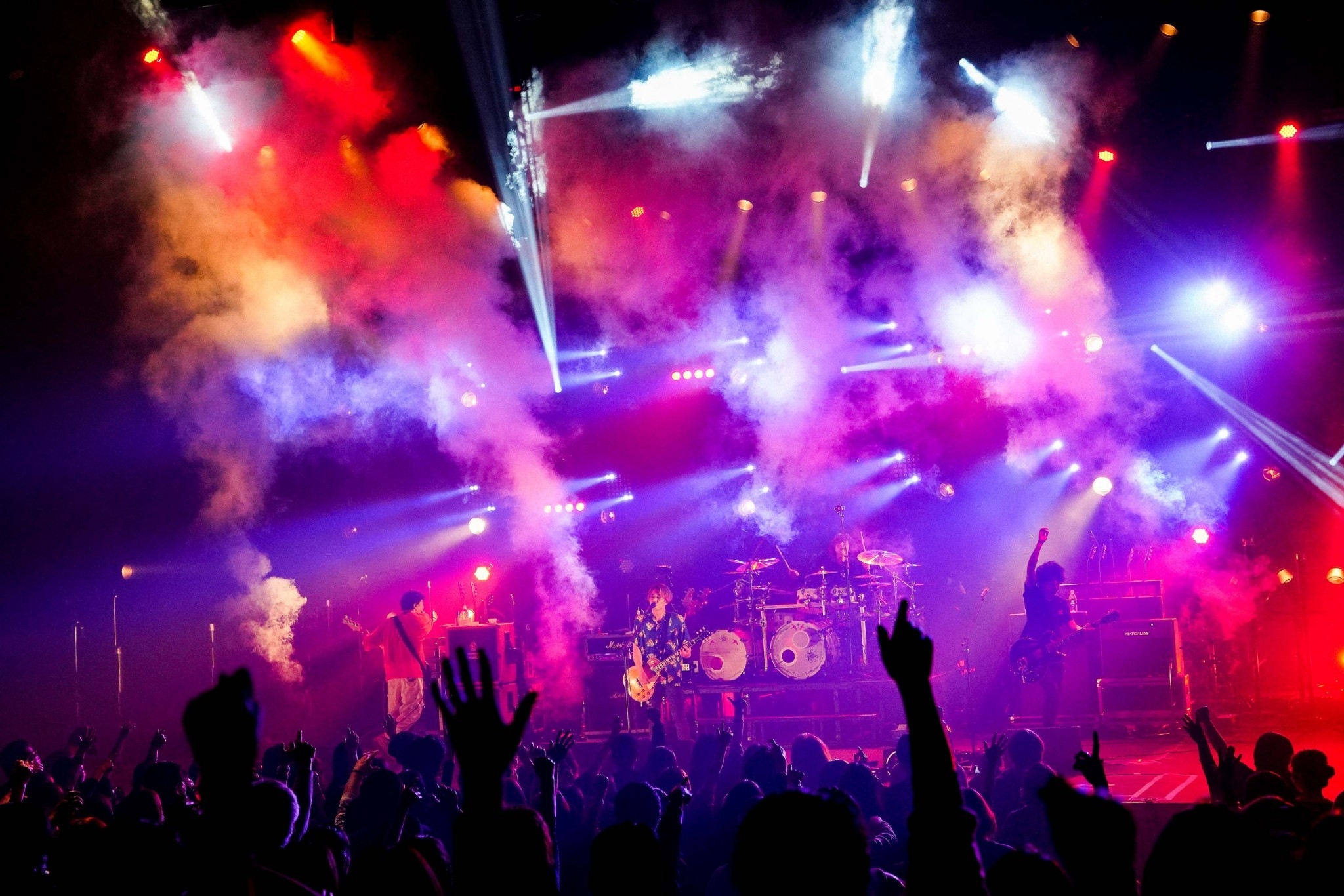 「Falling Pieces」から「PUPA」へ、ミドル/アップテンポを連ねて徐々にスピードを上げて「No Turning Back」へ。「よく来たな渋谷! 会いたかったよ」と村松が叫ぶ。明るい開放感に溢れる「きらめきの花」は、3階席のてっぺんのオーディエンスまでも心地よい一体感に包まれる、幸せなダンスチューンだ。比較的初期の楽曲から『ANSWER』の楽曲へ、えり抜きのライブチューンを揃えたセットリストは現時点でのベストだろう。音のカタマリが風圧として押し寄せてくるが、体に当たる力は心地よくホットでピースフルなのも、14年のキャリアの円熟のなせるわざか。