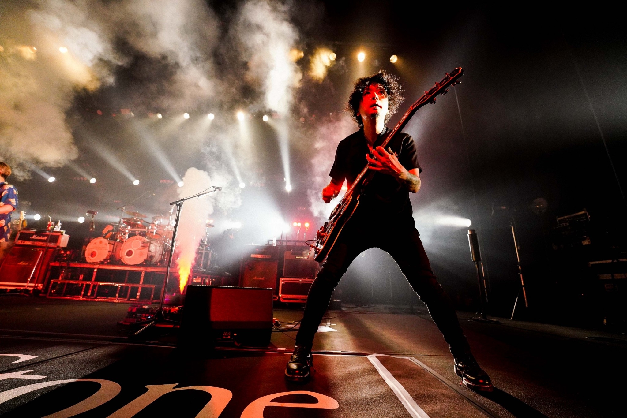3週間前に配信リリースされたばかりの「Fuel」は、超重量級のリズムとサイケデリックに歪むギターが迫り来る、メタルコアとダンスロックが合体した強烈な1曲。和やかなアコースティックから一瞬でラウドロックな世界へ引き戻すと、「Mirror Ocean」「Milestone」とヘヴィな楽曲を畳みかけて波に乗る。カラフルなレーザービームが空間を切り裂き、ライトが激しく点滅する中、日向の狂気じみたスラップ、生形のプログレめいたトリッキーなリフ、シーケンスと一体になって細かい16ビートを刻む大喜多のテクニカルなスティックさばきと、それぞれの必殺技が炸裂する。そんなバケモノめいた演奏を突き抜けて、言葉と感情を朗々と響かせる村松拓。今さらながら、Nothing’s Carved In Stoneはとてつもないバンドだ。