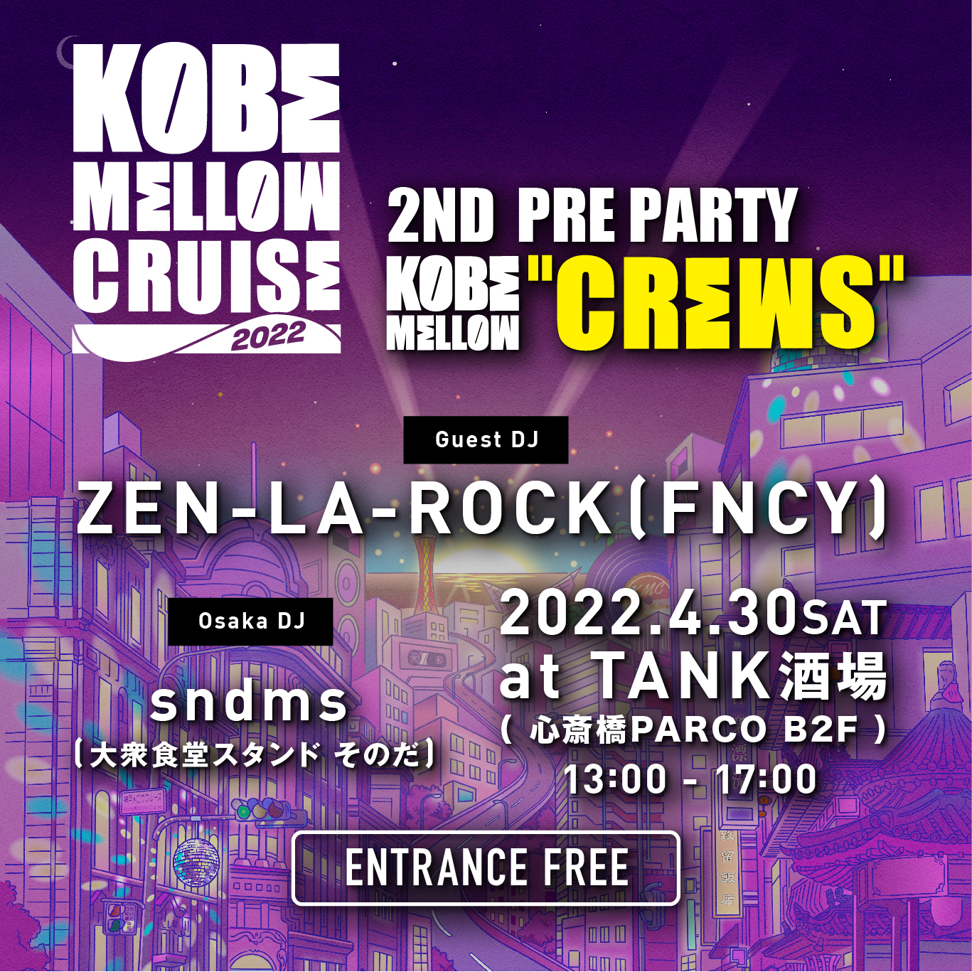 さらに、4月30日(土)には心斎橋PARCO内の飲食店・TANK酒場にて『2ND PRE PARTY 「KOBE MELLOW”CREWS”」』の開催が決定。5月の「メロクル」出演アーティストである、FNCYのZEN-LA-ROCKも登場する。