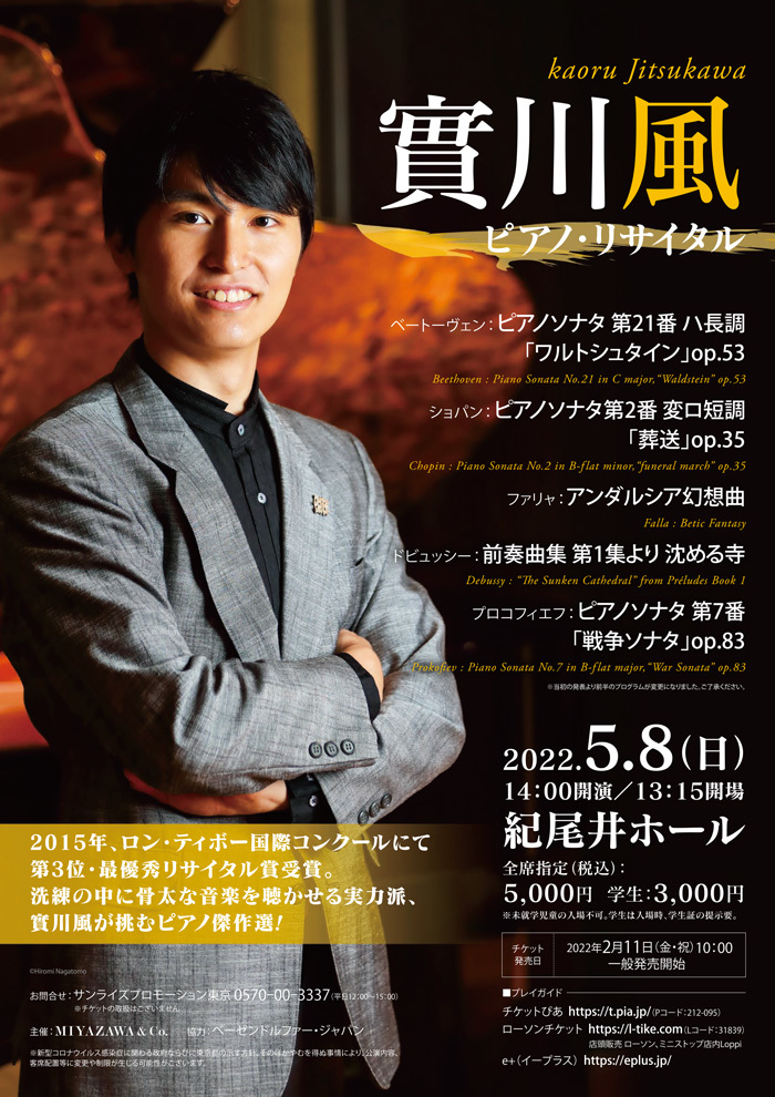 2015年、パリでのロン・ティボー・クレスパン国際コンクールで第3位に入賞し、2016年には、イタリアのカラーリョ国際ピアノ・コンクールで第1位を獲得した、實川風(じつかわ・かおる)。近年、協奏曲や室内楽などでも活躍の彼が、2022年5月8日(日)に紀尾井ホールでソロ・リサイタルをひらく。ベートーヴェン、ショパン、プロコフィエフの計3つのソナタを含む、多彩かつ意欲的なプログラムである。