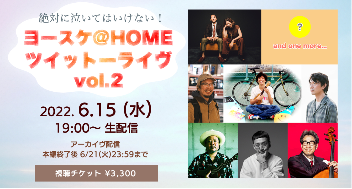 2019年、37歳の若さで突然この世を去ったヨースケ@HOME。彼と交流の深かったアーティスト7組が集結しての生配信ライブ第2弾が開催される。現在発表されているのは、KAN、UKULELE GYPSY(キヨサク from MONGOL800) 、JiLL-Decoy association(chihiRo, towada)、菅原龍平 、林幸治(TRICERATOPS)、PES。