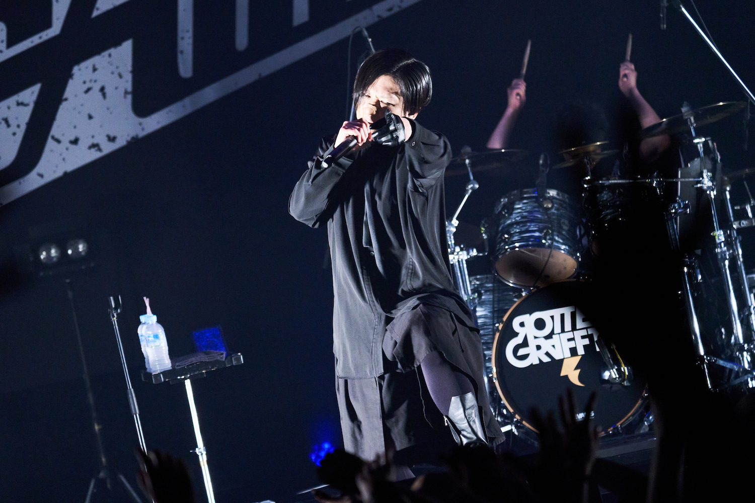 ASHの誘い文句から始まったのは新曲「Merry Go Round」。ラップもヘヴィネスもポップも飲み込み、抑えきれない衝動を自覚した瞬間をリリックにした曲だ。ASHが名古屋でバンド活動していた時期、ROTTENGRAFFTYから大いに刺激を受け、突き動かされた経験を持っているだけに、言葉のひとつずつに力も入る。十代の頃、ROTTENGRAFFTYから受け取ったものを、しっかり返すがごとく。さらに曲が進む中で「オマエらのカッコいいところ見せてみろ!」とオーディエンスを鼓舞させていく。約10年前のあの日、ROTTENGRAFFTYのライブを客席側で観ていた自分が、今はROTTENGRAFFTYと対バンをしている。さあ、次はオマエらの番だ、とばかりに。夢を現実にした男だからこその説得力がそこにある。開演直前のメンバーの武者震いに似た感情が、フロアの全員に一気に伝染。声を出せない代わりに力強いコブシが次々に突き上げられていった。
