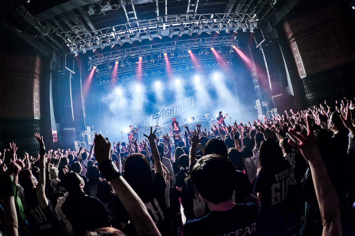 まずステージに立ったのは、ゲスト・アクトの桃色ドロシー。もともと高校の軽音楽部で知り合ったハキイ。(G/Vo)とキシベ(Ds/Cho)らを中心に約10年前に結成されたロック・バンドだ。軽音楽連盟主催『神奈川県大会』で3大会連続優勝を飾るなど、注目を集める高校生ガールズ・バンドでもあった。これまで活動は地元の横浜など関東を中心としていただけに、知名度という点では全国区に及ばないかもしれない。この日も、初めましてのお客さんがほとんどだったと思う。