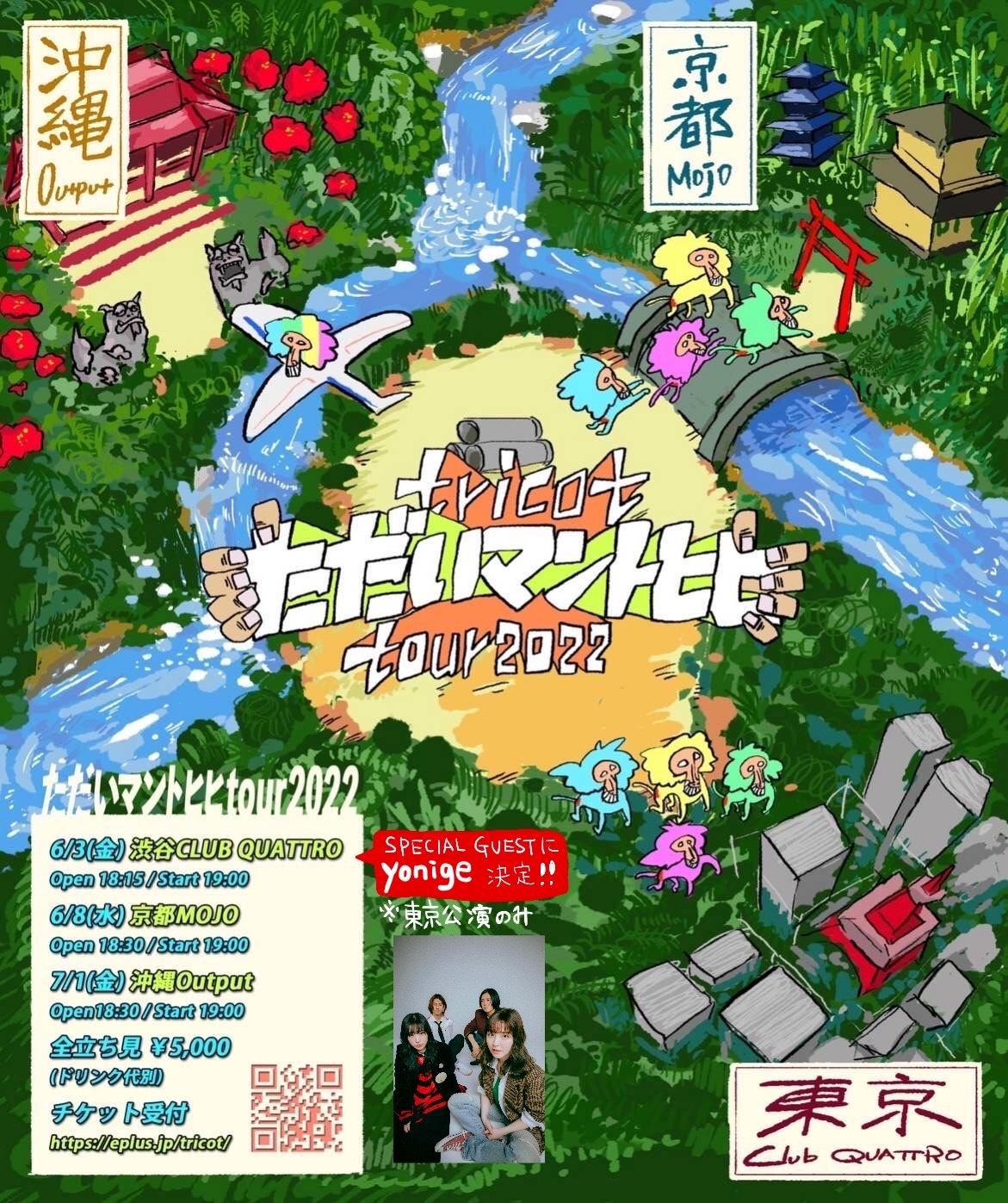 tricotのワンマンツアー『ただいマントヒヒtour 2022』初日公演、6月3日(金)東京・渋谷クラブクアトロ公演に、急きょyonigeの出演が決定した。