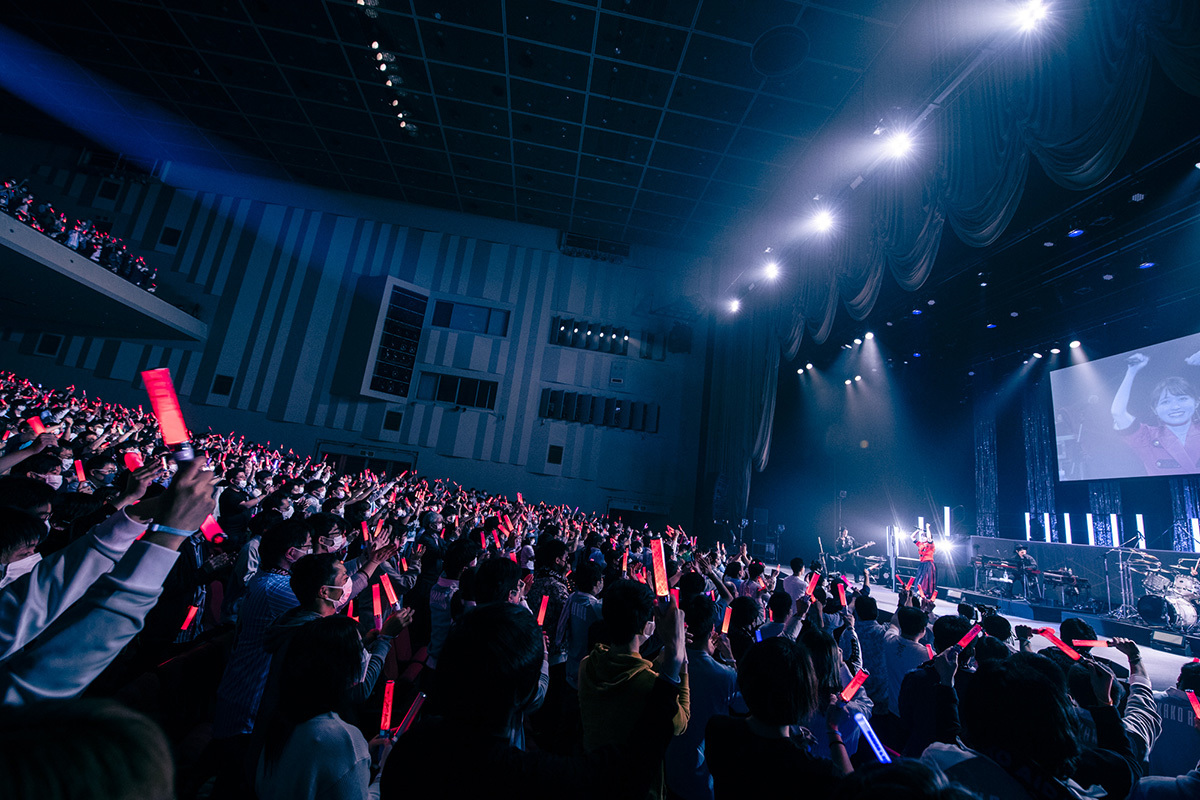 MCで「1曲目、緊張したー!」と漏らしつつ、久しぶりにファンと直接交流できる機会を喜ぶ逢田。「フィクション」のイメージにちなみ新調したという赤い衣装をアピールしたあとは、次の楽曲「Lotus」へ。1stアルバム『Curtain raise』のリード曲であり、彼女が初めて自分で作詞をしたナンバーだ。滑り出しはしとやかながら、サビで一気に力強く色づく歌声は、深い水の中から蓮の花が開く様子そのもの。バンドによるダイナミックな生演奏も手伝って、よりエモーションが伝わってくる。そこから爽快かつ切なさも湛えた「君がくれた光」に繋げ、ファンと一緒にこれまで重ねてきた時間への思いを馳せる。