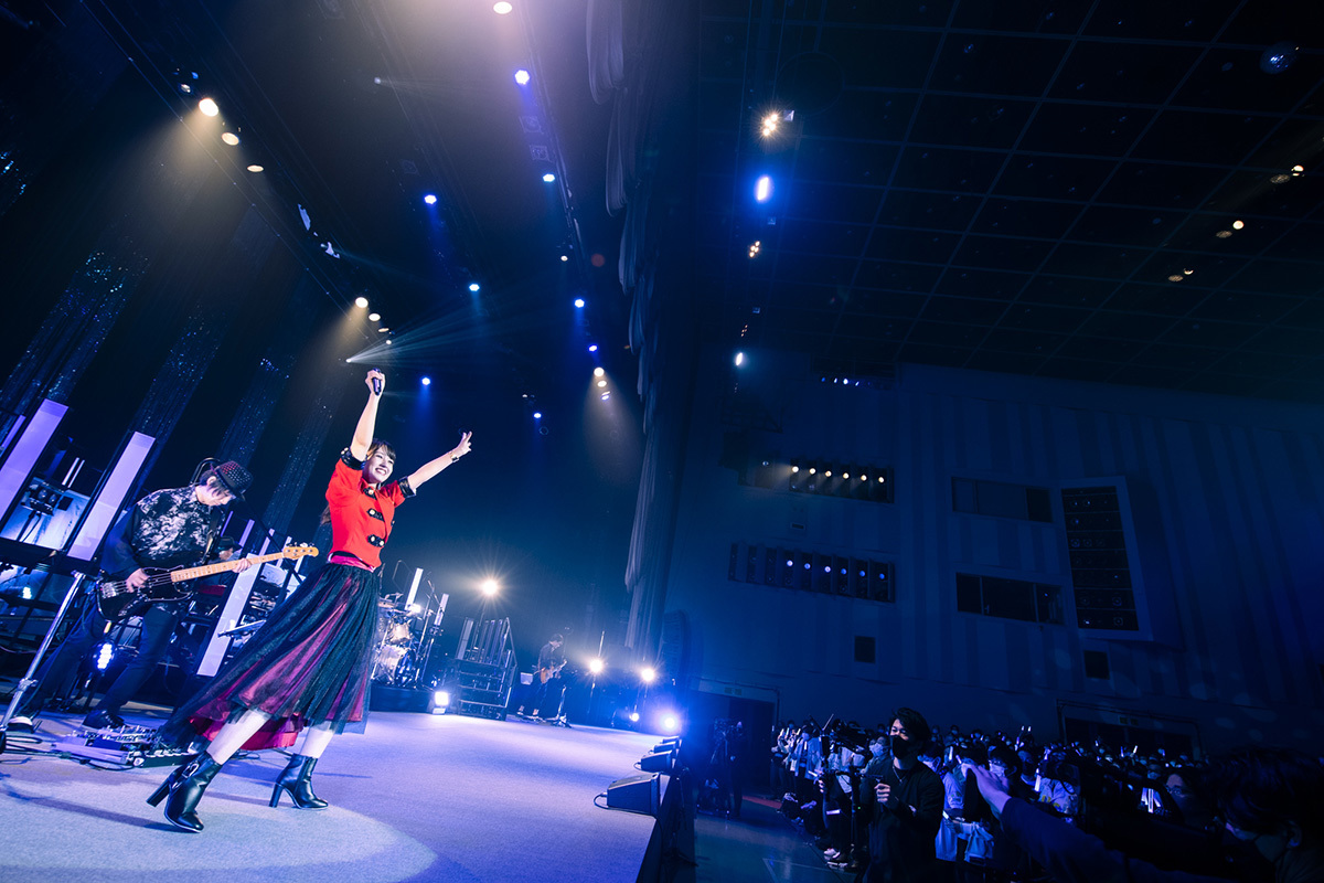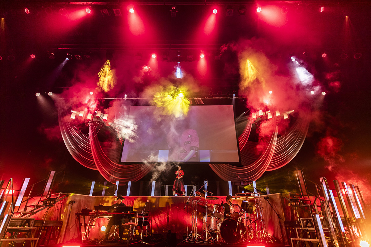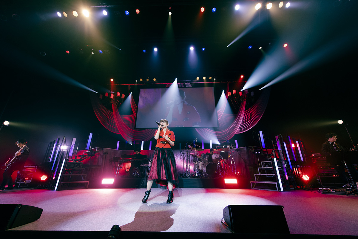 ライブはブラスサウンドを交えたジャジーなナンバー「フィクション」で幕を開け、赤いジャケット風の衣装に身を包んだ彼女は、照明が派手にきらめくなか、ステージを移動しながらパフォーマンスを披露。そこからシングル曲「for…」を連続で畳みかけ、開始早々アグレッシブな2曲で会場のボルテージを引き上げる。