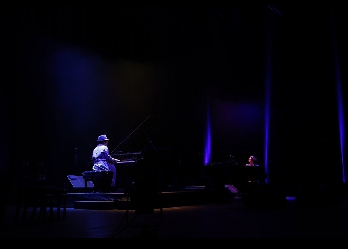 大野雄二の名旋律は、しだいに加速し、熱を帯びる。やがて曲調が変わると、上手から現れた角野の音が、はじけるように飛び込んだ。サンバのリズムで繰り広げられる、クールで熱いセッション。時に立ち上がり、楽しげに踊るように鍵盤を操る二人の鮮やかな音の色彩に、心臓を鷲掴みにされた。