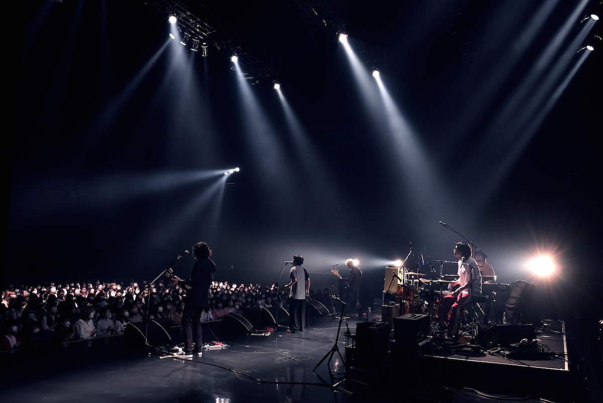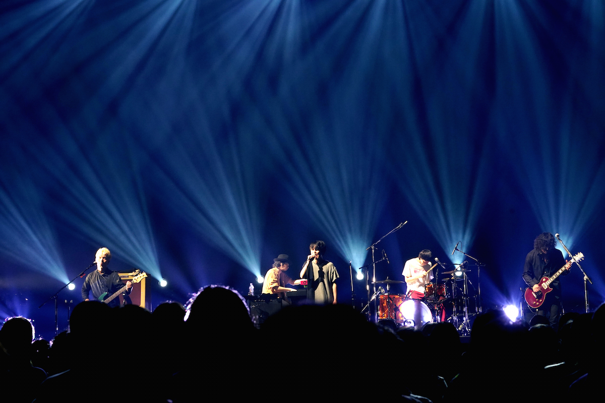 ファンクラブイベントならではの近い距離のトークコーナーを終えると、ステージに張られていた紗幕が落とされ、バンドセッティングが姿を現した。スタジオでジャムった音源をそのまま録音した様な、のほほんとしたSEをバックに、塚本史朗(Gt)、安達貴史(Ba)、茂木左(Dr)、本間ドミノ(Key)と、渋谷すばる(Vo)が登場した。この面子でのライブは今回が初。幕張メッセで観た『渋谷すばる LIVE TOUR 2020「二歳」』とは違うバンド編成である。広いステージを敢えて有効活用せず、中央にギュッと集めてセッティングされたバンドセットは、小箱のライブハウスを切り取ったかの様な光景だった。