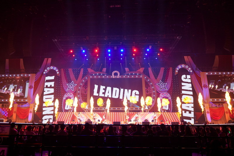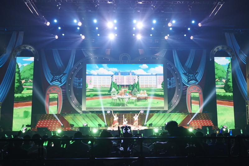 幾多もの輝きの中にウマ娘達のシルエットが映し出されるムービーと、煌びやかなライティングの中で繰り広げられるウマ娘ダンサー達の迫力のダンスによるオープニングが繰り広げられる。その終わりを飾るように、ステージ最上段へと本日出走のウマ娘達がせり上がり、全員によるハーモニーで始まったオープニングナンバーは、ゲーム1周年を記念した楽曲「We are DREAMERS!!」だ。