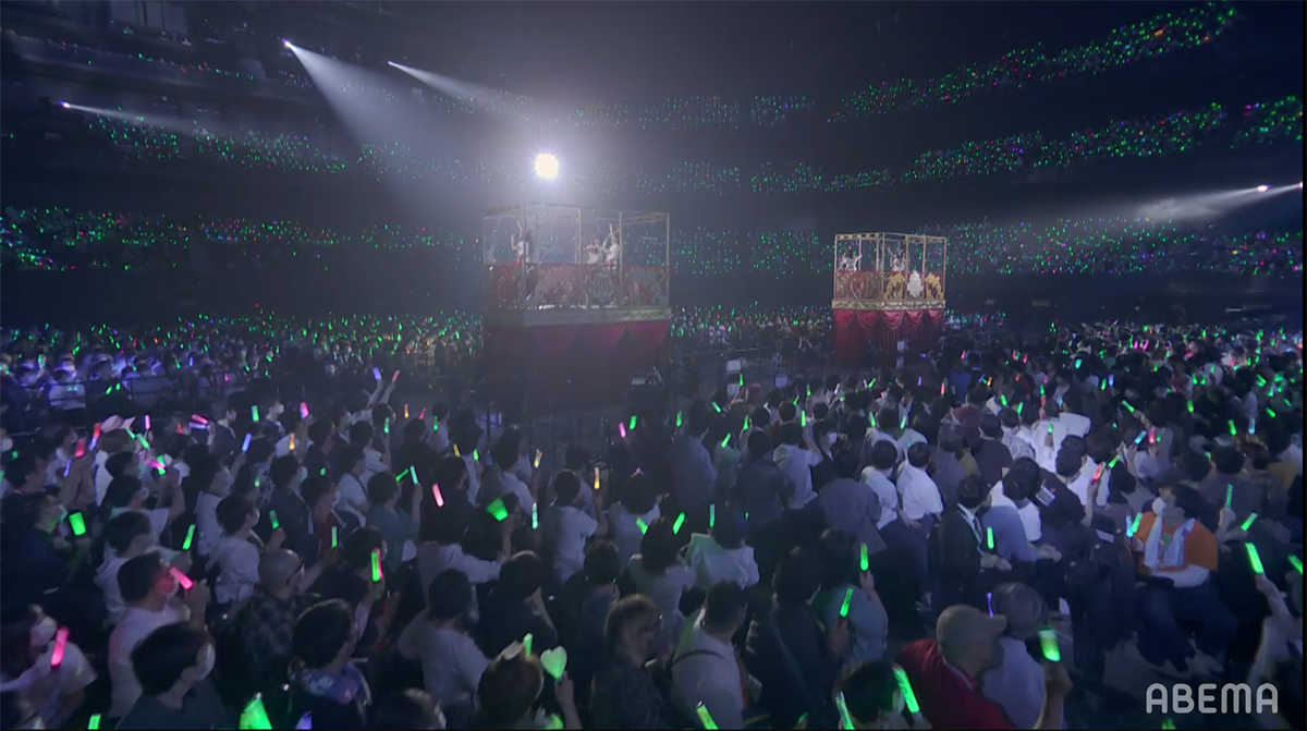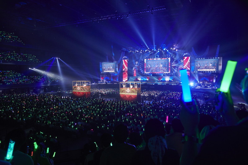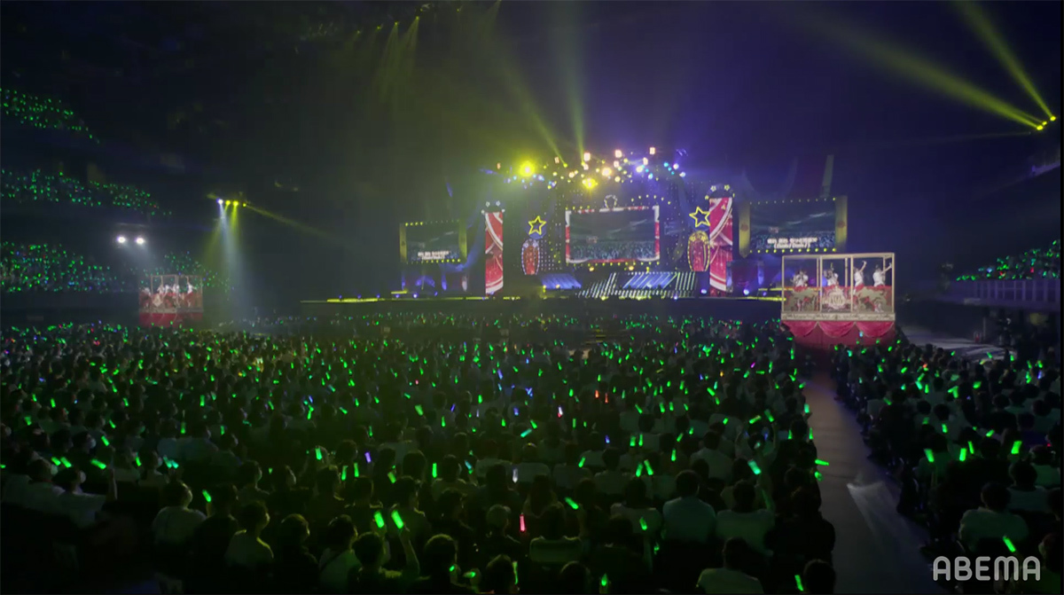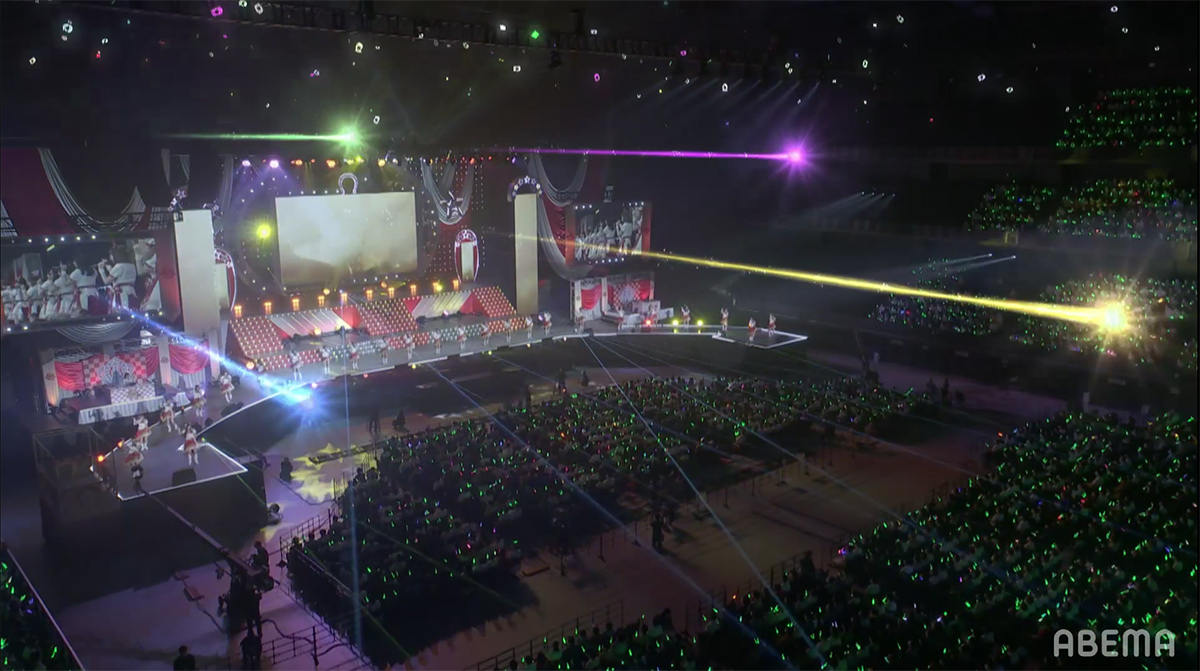 場内上空をレーザーの網が包む中の壮大なイントロからステージに全員が登場し、いよいよライブもクライマックスに。そのフィナーレを飾るのは東京公演と同じ「大好きのタカラバコ」だ。ファンの応援によってもたらされた、ウマ娘達の宝箱に収まりきらないほどの夢と言う名の宝物、それを大切に抱えながらこれからも走り続けるという想いを壮大なハーモニーで唄い上げていく。