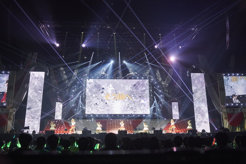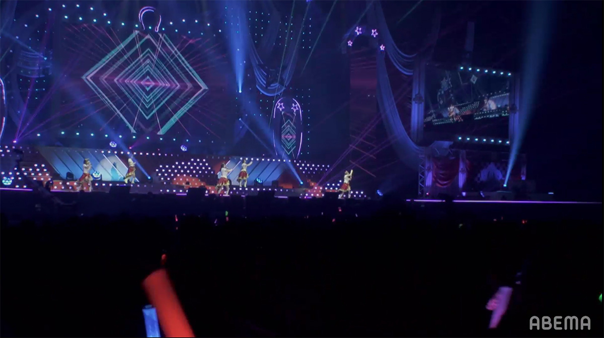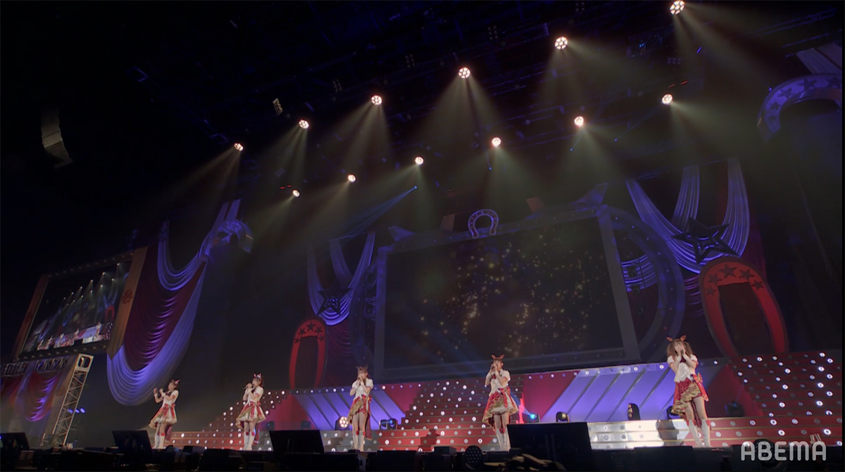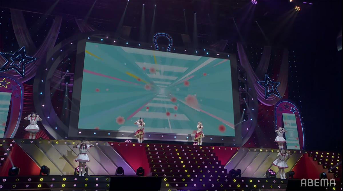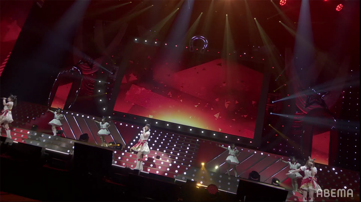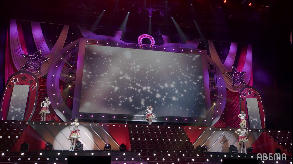 シンセサイザーサウンドが響き渡り、レーザーとスクリーンのグラフィックで幾何学の世界が場内に描き出される。赤とピンクのライティングとコンサートライトの輝きと共に始まったのは、ゲーム中の短距離・マイルのGⅠレースで勝利した者が唄えるナンバー「本能スピード」だ。