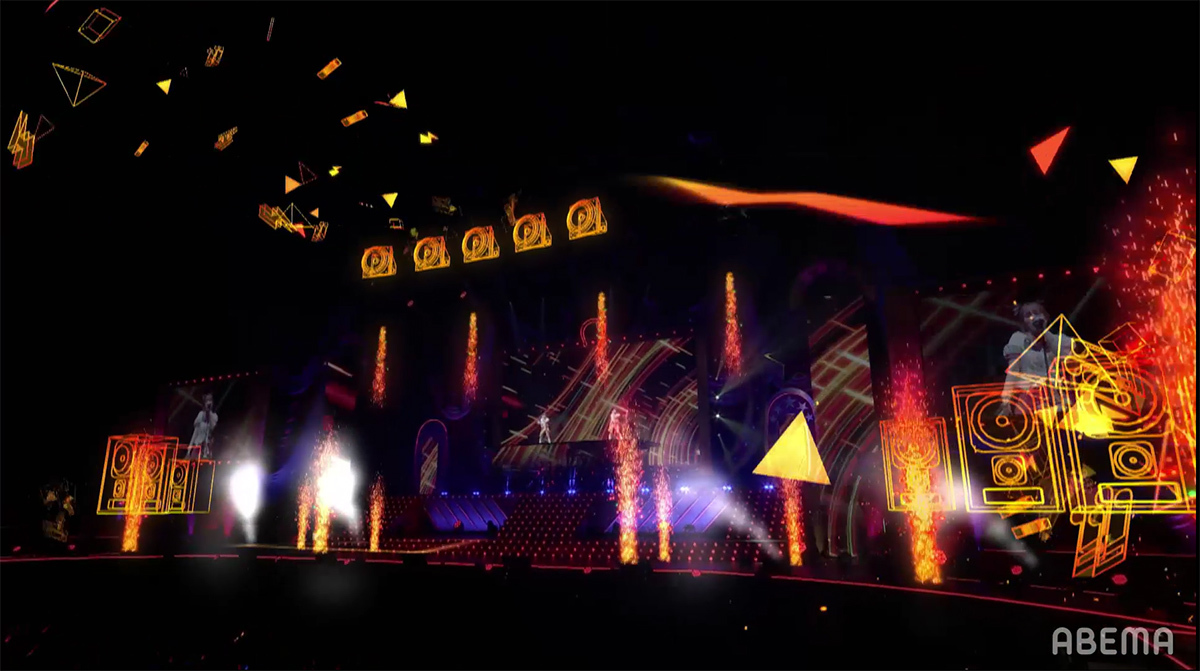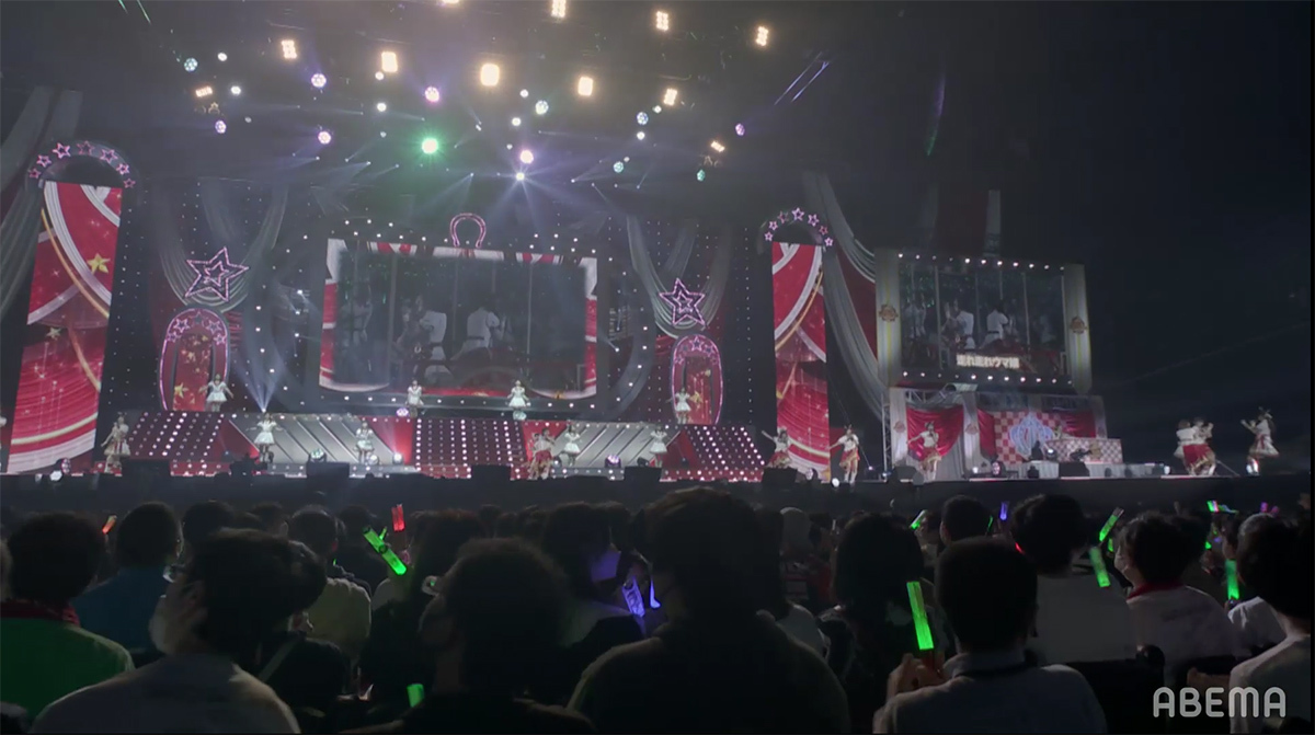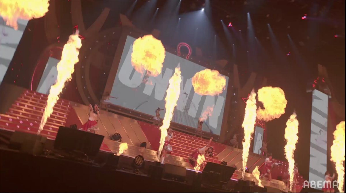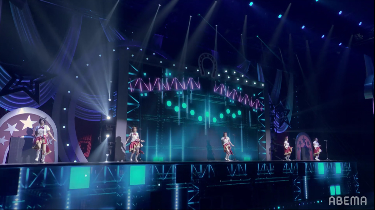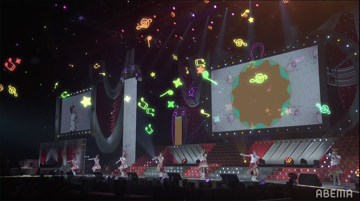 シンセサイザーサウンドが響き渡り、レーザーとスクリーンのグラフィックで幾何学の世界が場内に描き出される。赤とピンクのライティングとコンサートライトの輝きと共に始まったのは、ゲーム中の短距離・マイルのGⅠレースで勝利した者が唄えるナンバー「本能スピード」だ。