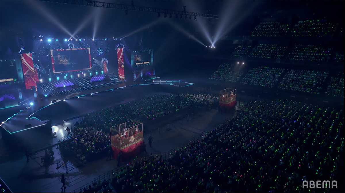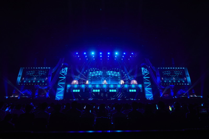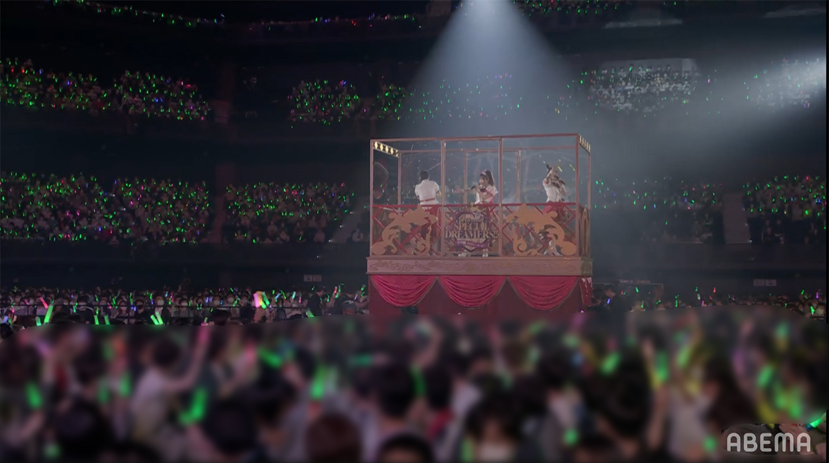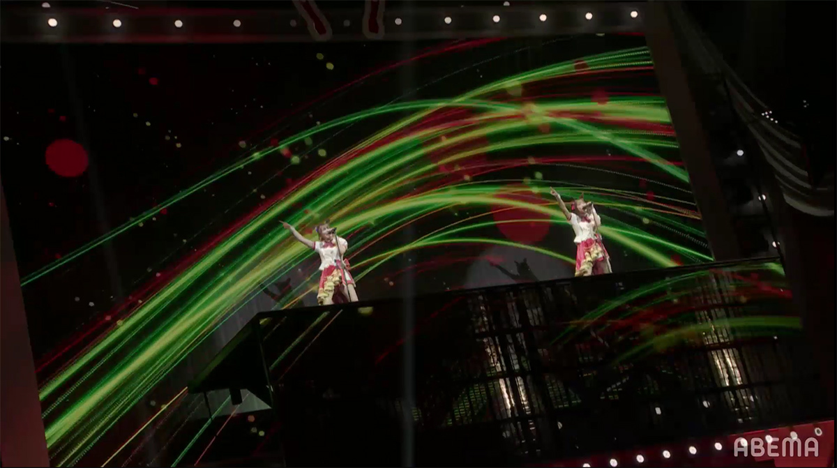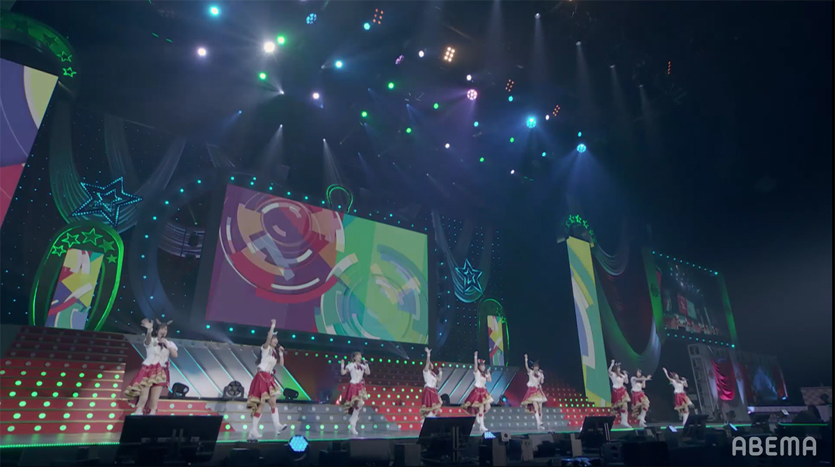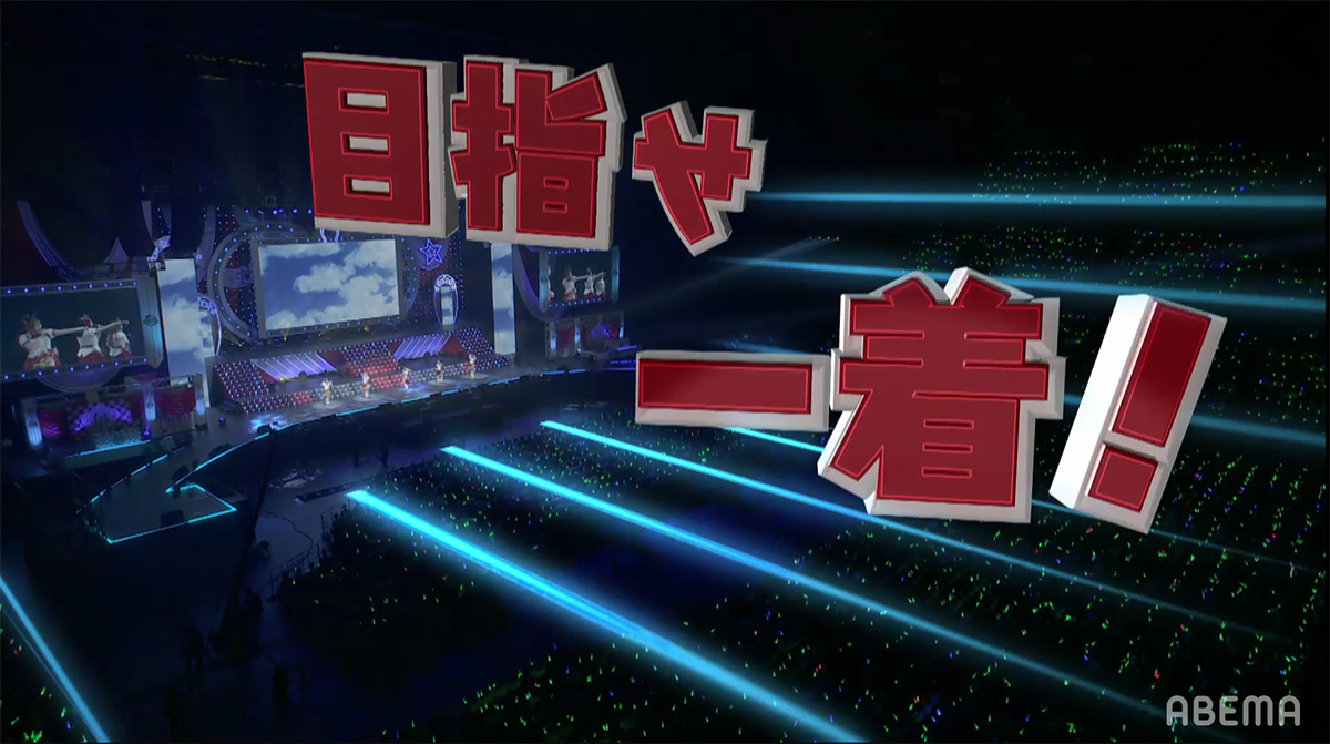 シンセサイザーサウンドが響き渡り、レーザーとスクリーンのグラフィックで幾何学の世界が場内に描き出される。赤とピンクのライティングとコンサートライトの輝きと共に始まったのは、ゲーム中の短距離・マイルのGⅠレースで勝利した者が唄えるナンバー「本能スピード」だ。