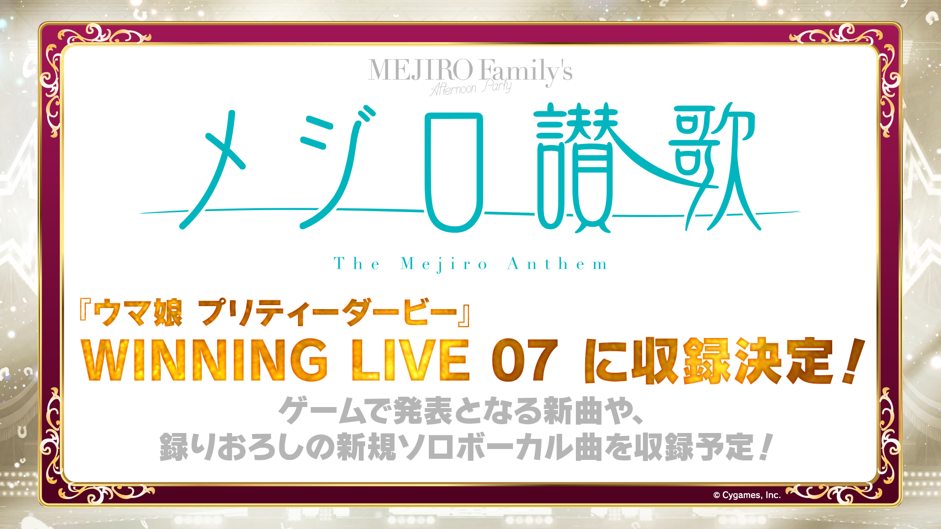 メロディに合わせて大きな弧を描くように振られるコンサートライトに合わせて、会場が一体となってメジロを讃える時間が紡がれていった。さらにラストでは「メジロ讃歌」が近日発売予定のCD「WINNING LIVE 07」に収録決定の告知も。プレゼント企画のレコードでしか聴けないのかと不安だったファンには嬉しいニュースの後に、ライブ後半戦を飾る他のメンバーも登場。