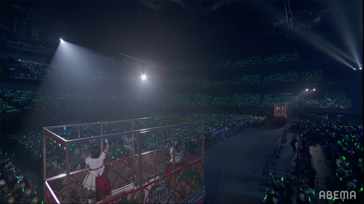 ハルウララ役・首藤志奈の言葉と軽やかなマーチのメロディと共に始まったのは、こちらも2018年以来のライブ披露となる「PRESENT MARCH♪」。オリジナルメンバーのマチカネフクキタル役の新田ひよりが今回はDAY2出演のため、ナリタブライアン役の衣川里佳を交えてゴンドラへと乗り込みアリーナを周回。楽しく軽やかなマーチのリズムと共に三者三様のボーカルが絡み合いハーモニーを奏でていく。