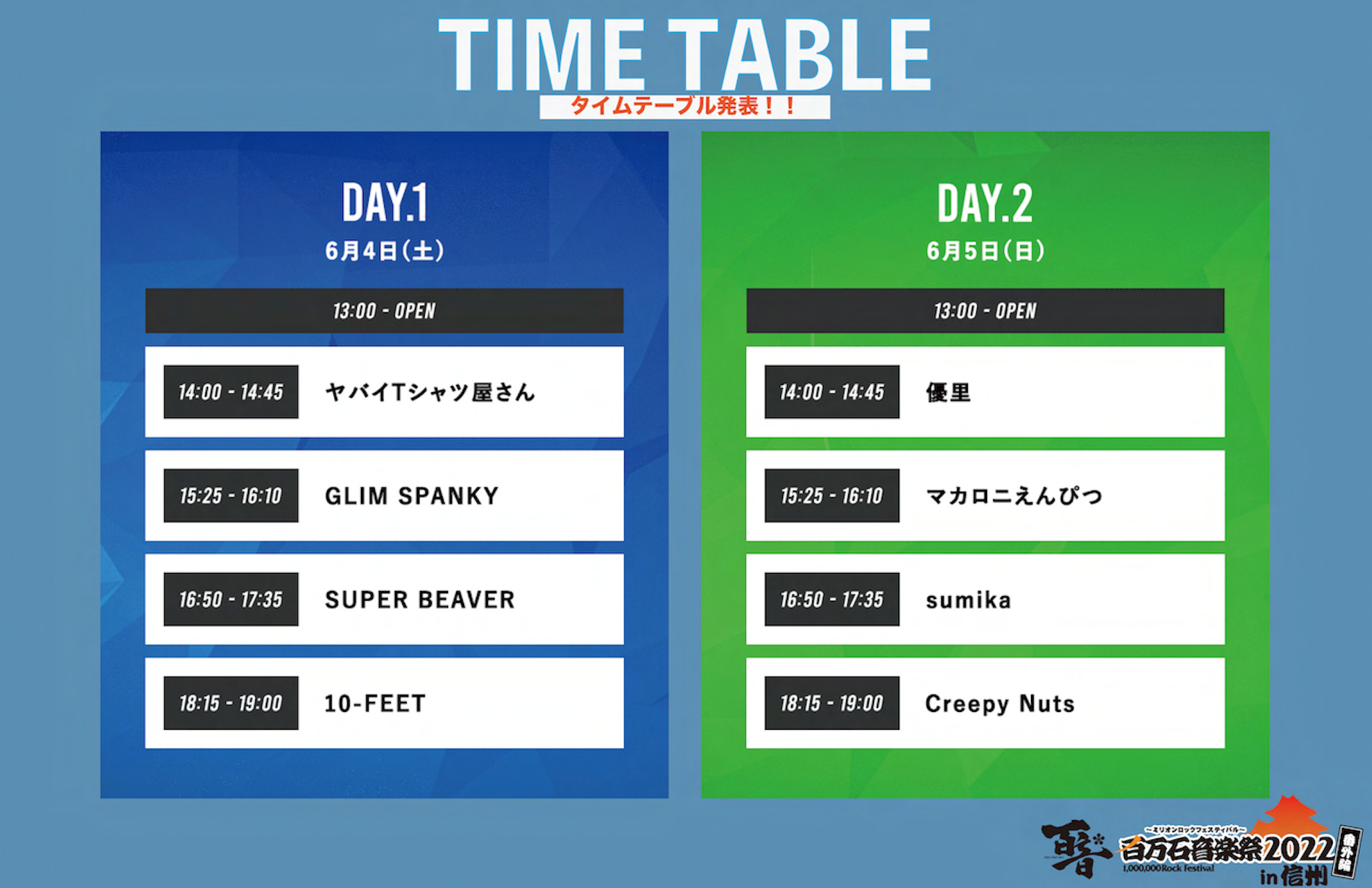 2022年6月4日(土)・5日(日)に長野ビッグハットにて開催される『百万石音楽祭2022~ミリオンロックフェスティバル~ 番外編 in 信州』のタイムテーブルが公開された。