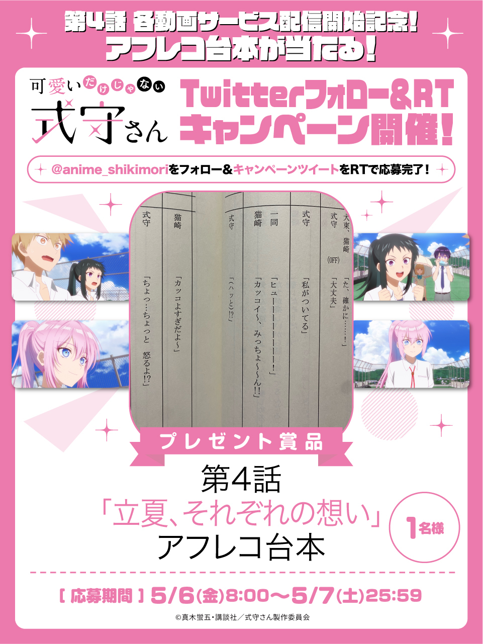 TVアニメ『可愛いだけじゃない式守さん』第4話の動画サービス配信開始を記念して、最新話のアフレコ台本が当たるTwitterフォロー&RTキャンペーン開催中だ。