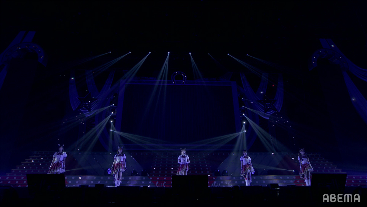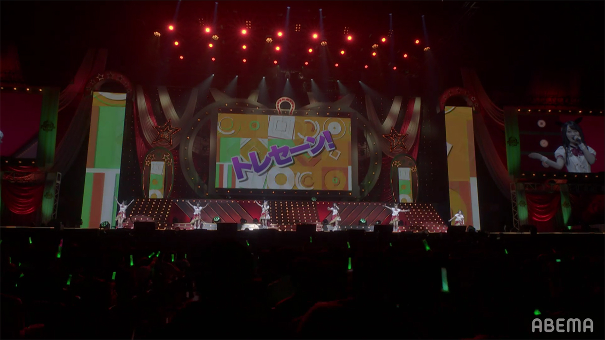 そして衣装披露ではウイニングチケット役・渡部優衣の発案で、端から順に回りながらウエーブを起こすという新たな見せ方で場内を沸かせたり、配信で見ているファンにタイキシャトル役の大坪由佳が画面を通してのリモートハグをするなどして盛り上がる中、いよいよライブパートの本格スタートとなった。