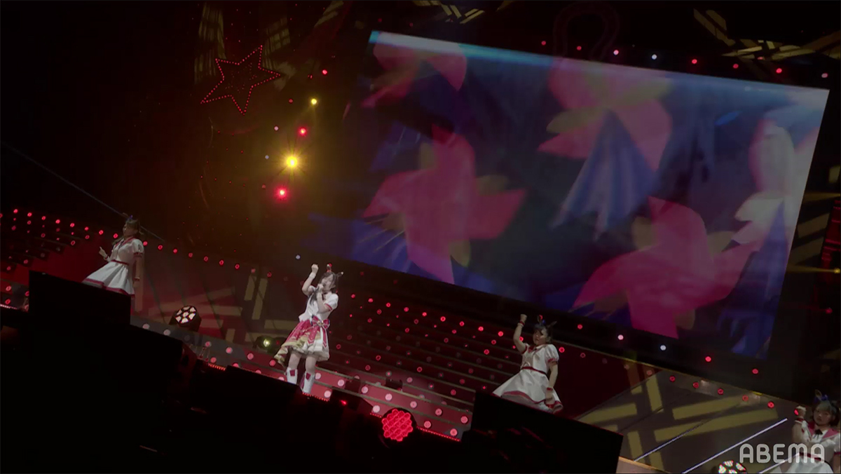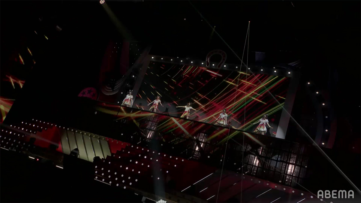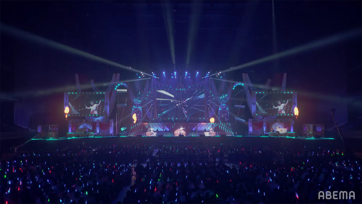 ライティングとコンサートライトで真紅と黒のコントラストでステージが染め上げられ。スクリーンや配信でのAR演出では「武」をイメージさせる様々な文字が飛び交うなど、『ウマ娘』の戦いの側面を熱く際だたせた唯一無二の曲とステージにファンも強く惹きつけた。