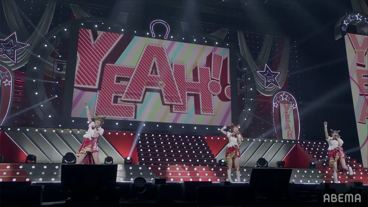カラフルなライティングを浴びながら、未来に向けて走るウマ娘達の感じる喜びを三人は可愛くポップに熱唱。普段は勇ましい曲が多いナリタブライアンも全力の応援をファンに煽りながらも可愛く唄い上げて見せた。