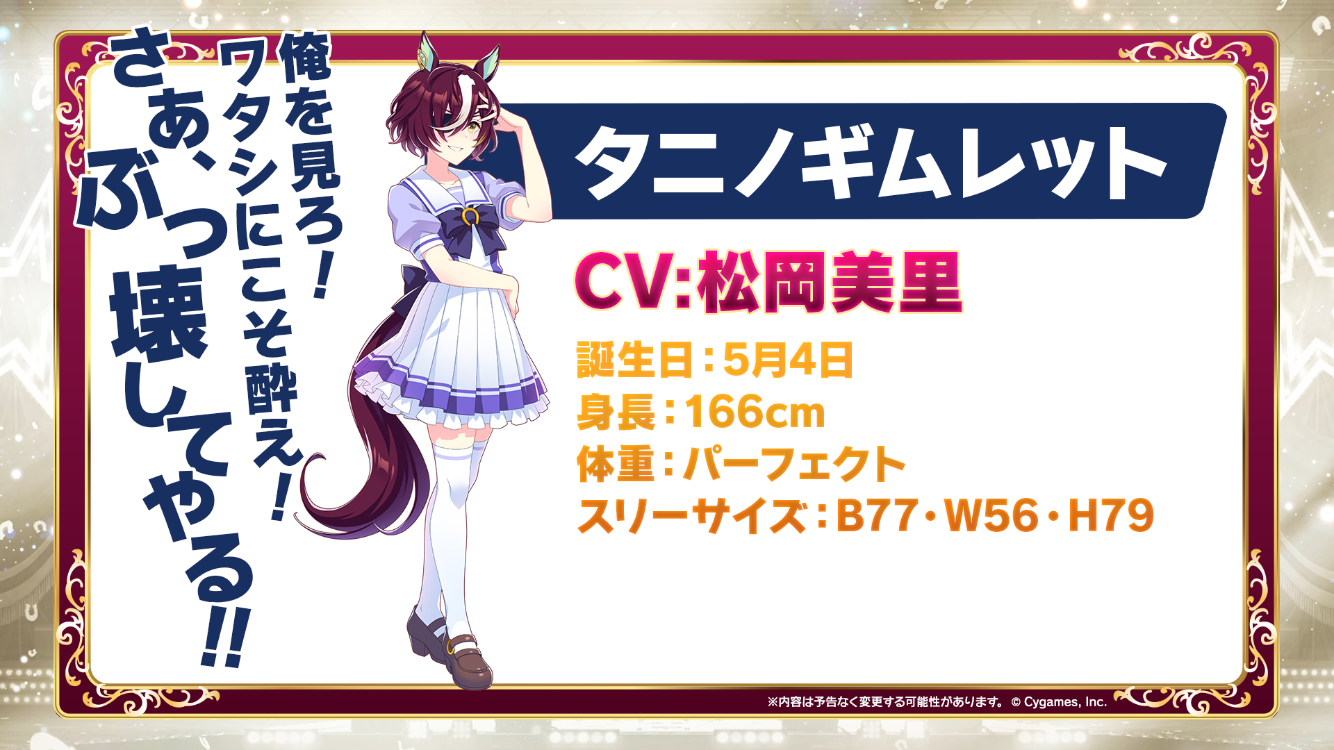 2003年に様々なGⅠ連覇記録を達成し近年の様々な強豪馬に血統が受け継がれたシンボリクリスエスに、ウオッカの父であり引退後もユニークな暴れっぷりで競馬ファンを楽しませているタニノギムレットがウマ娘になるというニュースは当日夜のTwitterでもトレンド入りする程の大反響となったので、今後の展開が楽しみなニュースとなった。
