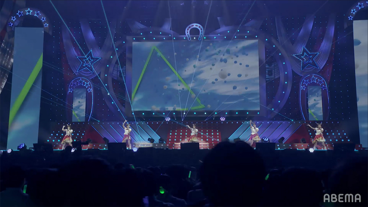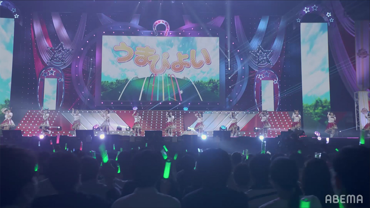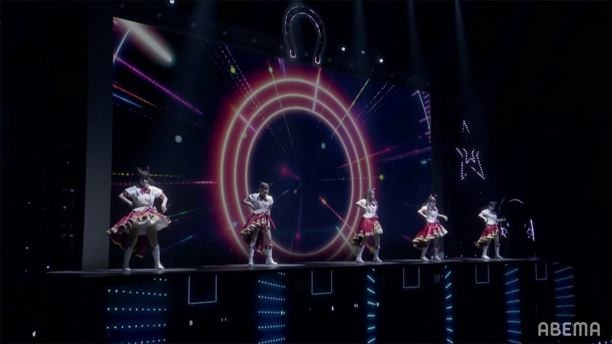 砂埃や泥にまみれても臆せず、ただ勝利を目指して全力で走り抜く決意の歌を、5人は力強いボーカルとハーモニーで熱唱。解説で登場したダートの絶対王者・スマートファルコンも負けたくないと闘志を燃やすほどの熱いライブと共に、様々な戦いの歌が紡がれたライブ中盤戦は幕を閉じた。