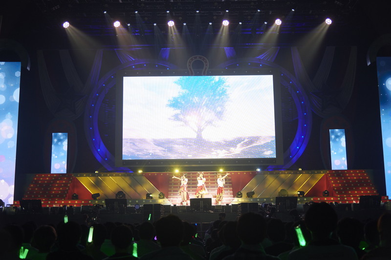 ステージではギャグ的な役回りの多いゴールドシップが、ファンに目に焼き付けておけと言いながらクールで力強い歌声を披露し、ナリタブライアンとヤエノムテキも負けじと力のこもったボーカルでステージのボルテージを上げていく。そしてサビのパートでは三人の声が重なり合ってステージも赤と炎で染まり熱を放ち、正に頂点に立つ王者の歌に相応しいパフォーマンスが繰り広げられた。