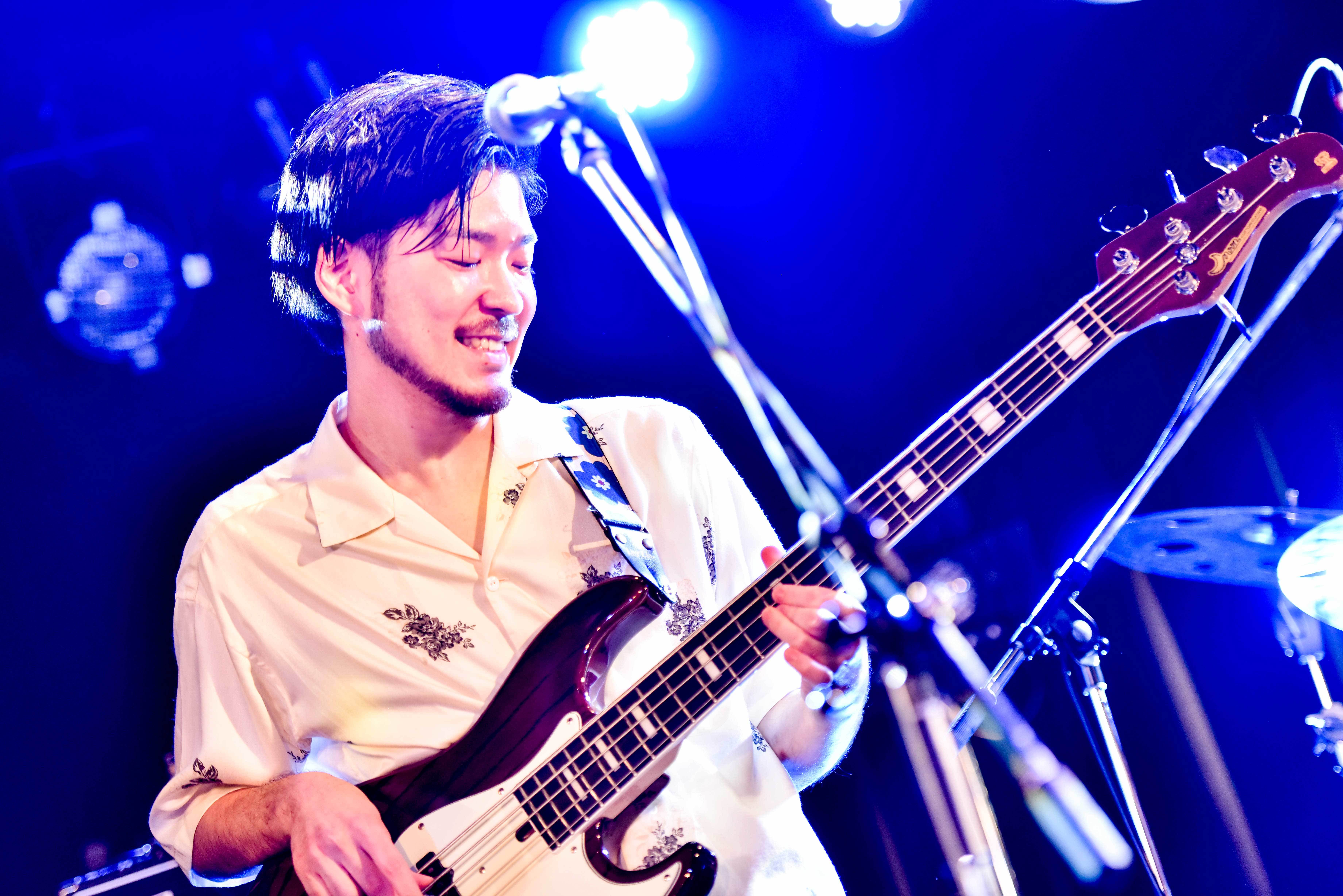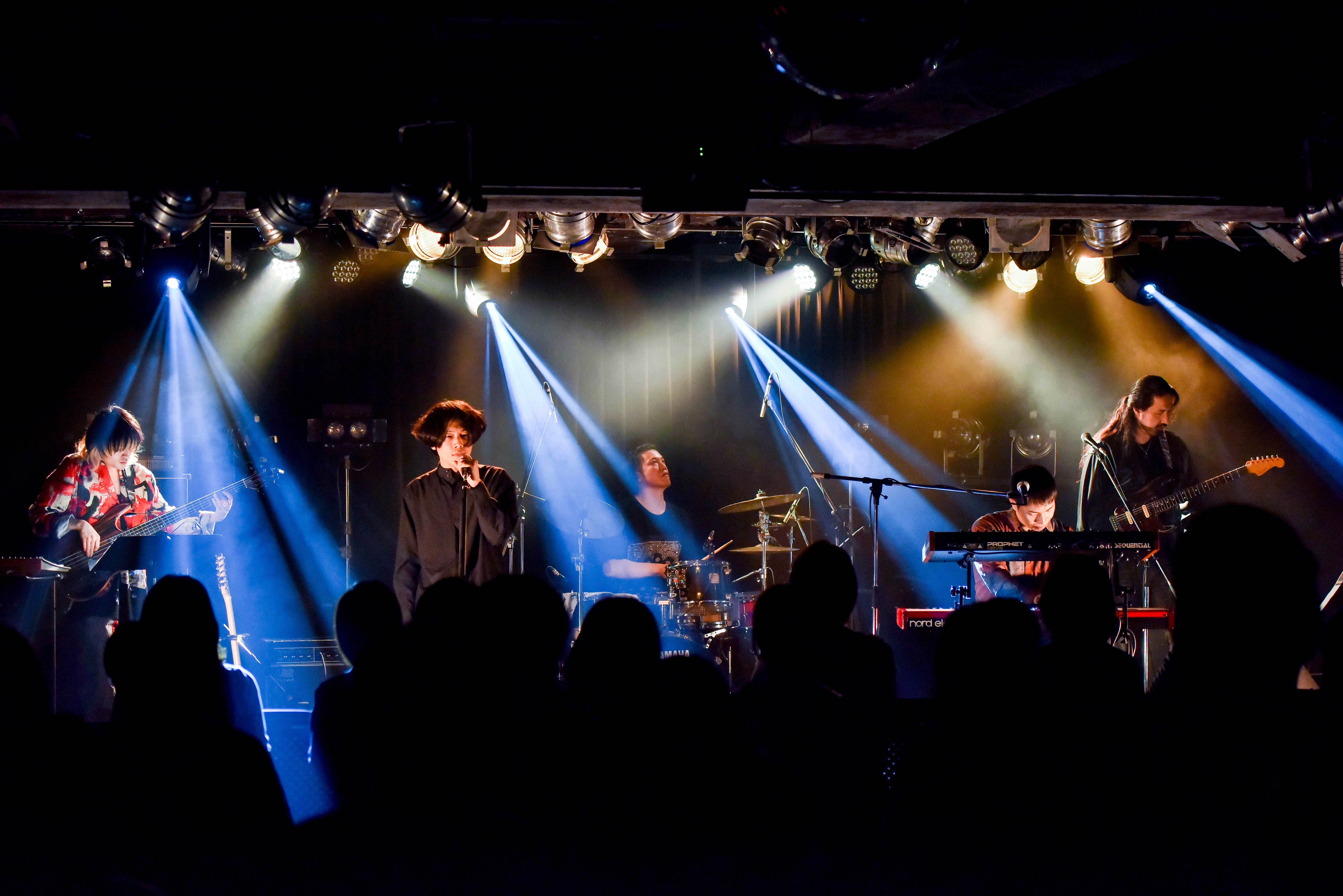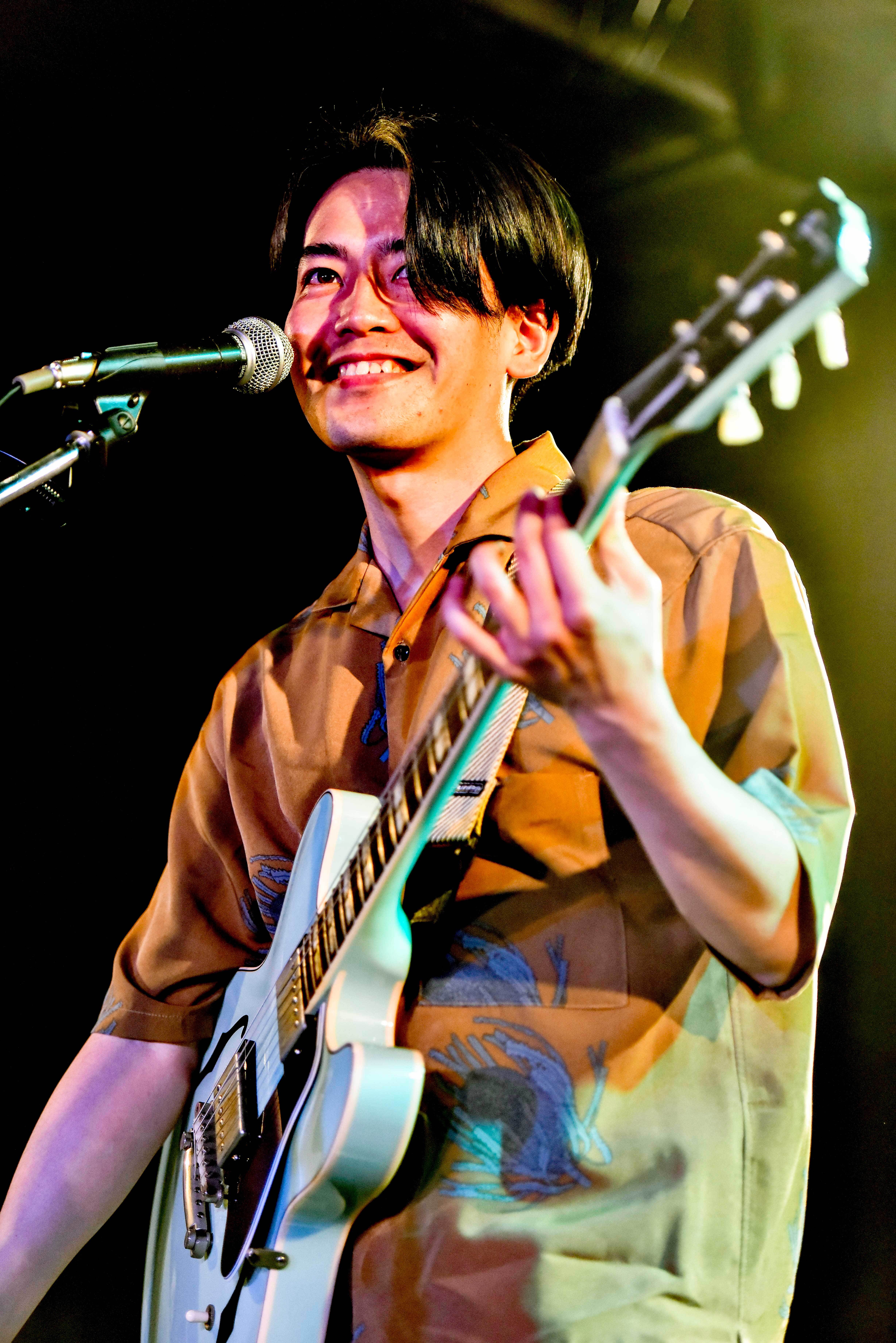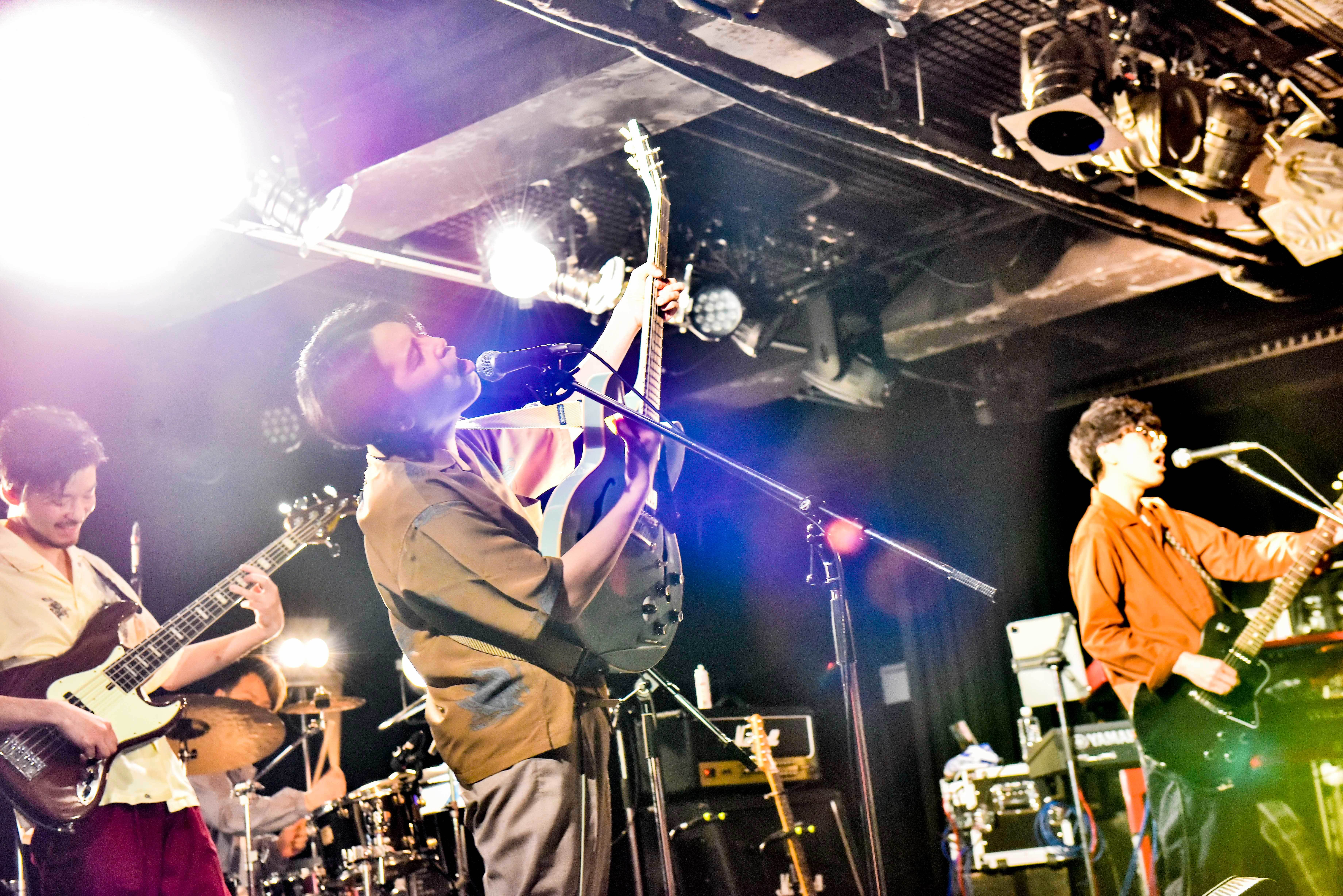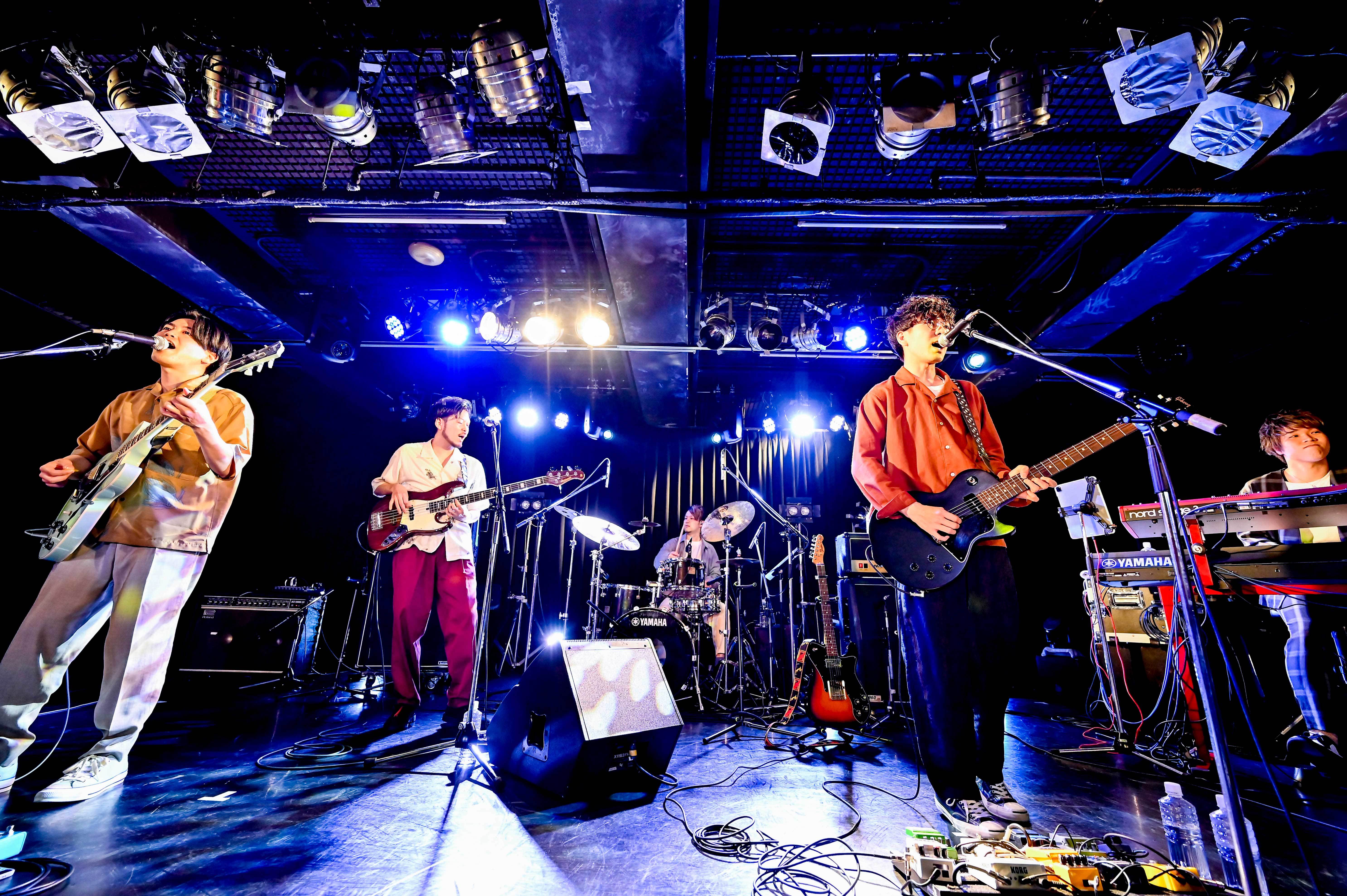 みずみずしいメロディと情景が脳内に浮かぶロマンティックなリリックの「流星タクシー」、エモーションあふれるギターソロに心躍る「雨」と、ポップスへのあふれる敬愛を隠さない彼ら。切ないファンクネスを内包した「浮かれてた」から小柳にマイクを託し、自由度の増した熱量高いギタープレイで魅せる盆丸。前田祥吾(Ba)は極太のベースラインで曲の輪郭を描き出す中、小柳は艶やかなボーカルを惜しみなく聞かせ、一気に客席の視線をとらえて離さない。