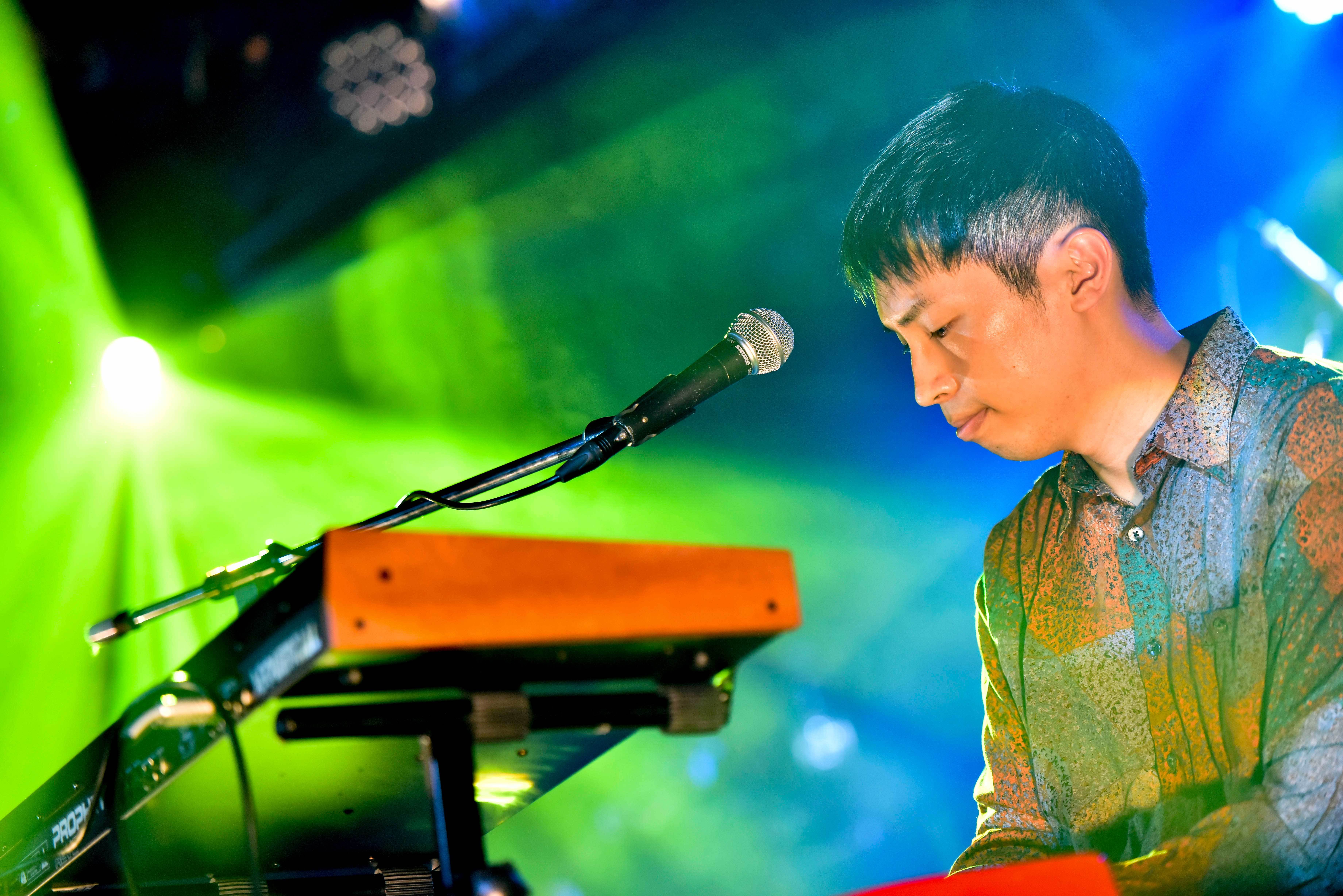 二番手にお目見えしたのは、映画監督の顔も持つフロントマン・甫木元空(Vo)と、ジャズピアニストでもある菊池剛(Key)の二人から成るBialystocks。初っぱなの「光のあと」から、凛とした甫木元の歌声の高潔さにまず驚かされる。展開するにつれ厚みを増していくサウンドは、まるで音の洪水が押し寄せてくるようで、一気にトリップする感覚に。ネオソウルのフレーバーをまとう「コーラ・バナナ・ミュージック」では、サポートの鶴田伸雅(Gt)が緩急自在に弾き倒すさまが実に鮮烈!