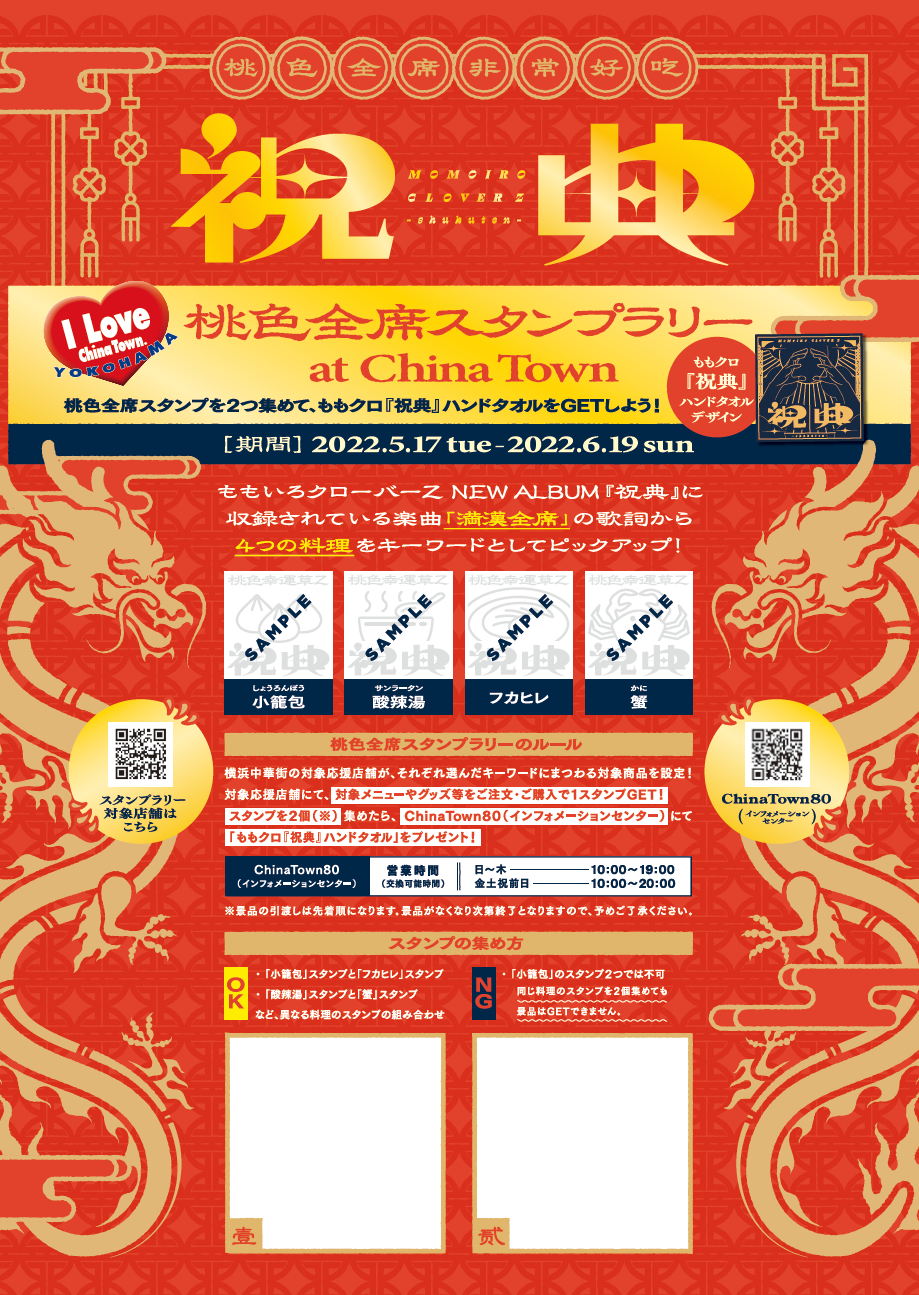 今回発表されたコラボキャンペーンは、横浜中華街で5月17日(火)から6月19日(日)の期間で開催。アルバム『祝典』に収録される「満漢全席」にかけた「桃色全席スタンプラリー at China Town」が対象応援店舗にて実施される。「満漢全席」の歌詞に登場する4つの料理をキーワードとして、各応援店舗が1キーワードを選択。そのキーワードにまつわる対象料理や商品が設定されており、注文・購入をすると1スタンプゲットとなる。異なるキーワードのスタンプを2つゲットすると、「ももクロ『祝典』ハンドタオル」をプレゼント!スタンプラリー用紙の配布やプレゼントの交換は、ChinaTown80(インフォメーションセンター)にて行われる。この機会に横浜中華街に訪れ、ももクロの『祝典』を