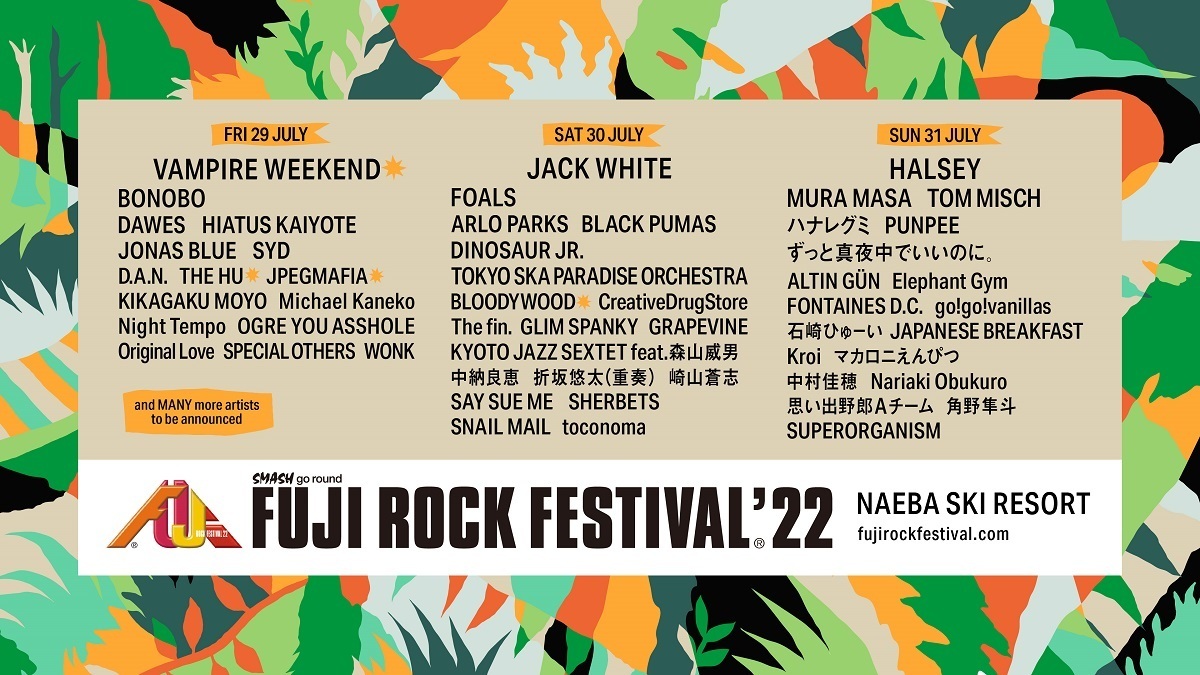ヴァンパイア・ウィークエンド(VAMPIRE WEEKEND)、ジャック・ホワイト(JACK WHITE)、ホールジー(HALSEY)がヘッドライナーを飾る今年の『フジロック』のチケットは先行販売中で、一般発売価格より最大3,000円もリーズナブルに購入できる。受付は6月16日(木)23時までだが、各受付とも規定枚数に達した場合販売が終了される。参加予定の人はオフィシャルサイトの「感染防止対策のガイドライン」や「各種注意事項」をよく確認の上、早めに手配しよう。