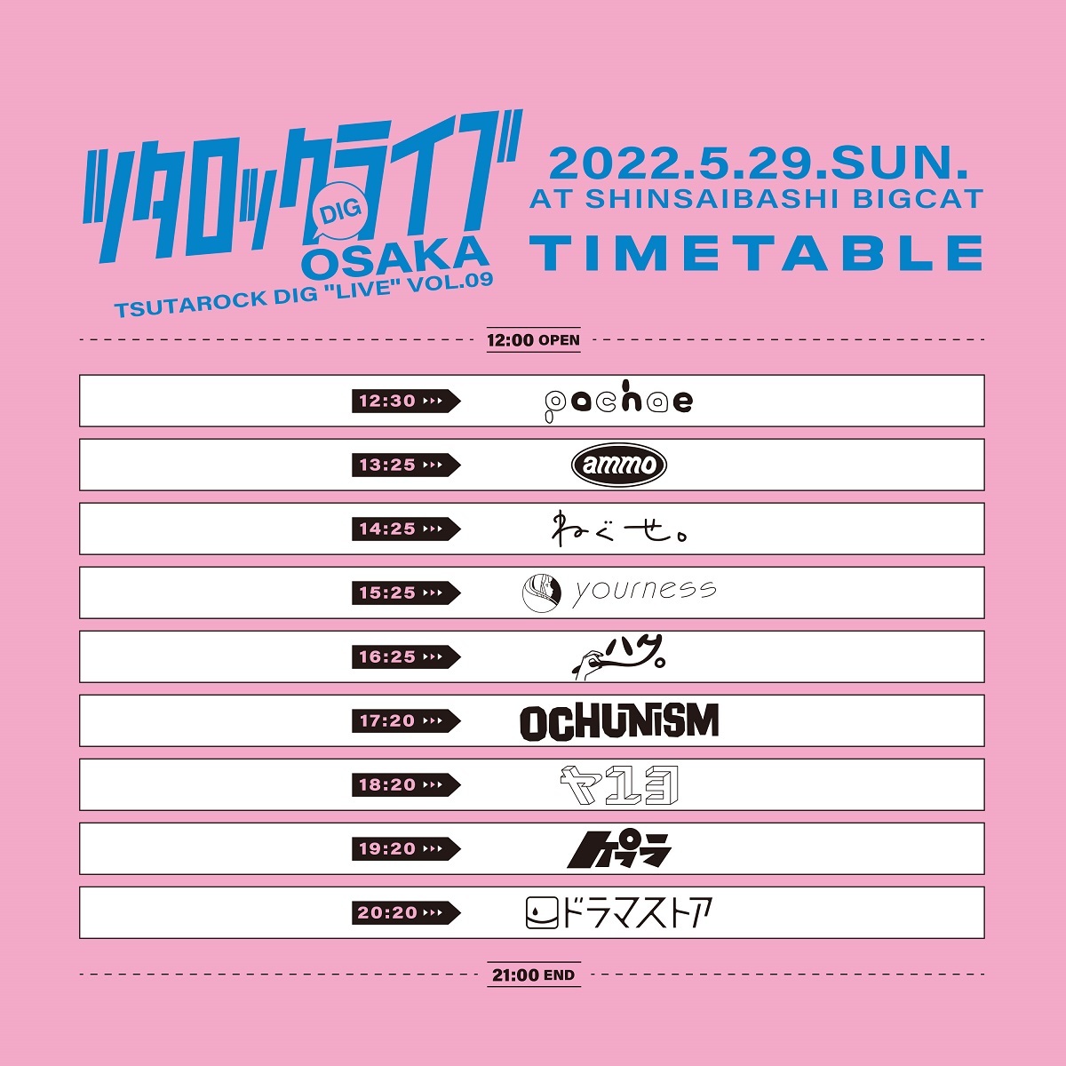 5月29日(日) 心斎橋 BIGCATで開催される『ツタロック DIG LIVE Vol.9-OASAKA-』のタイムテーブルが発表された。
