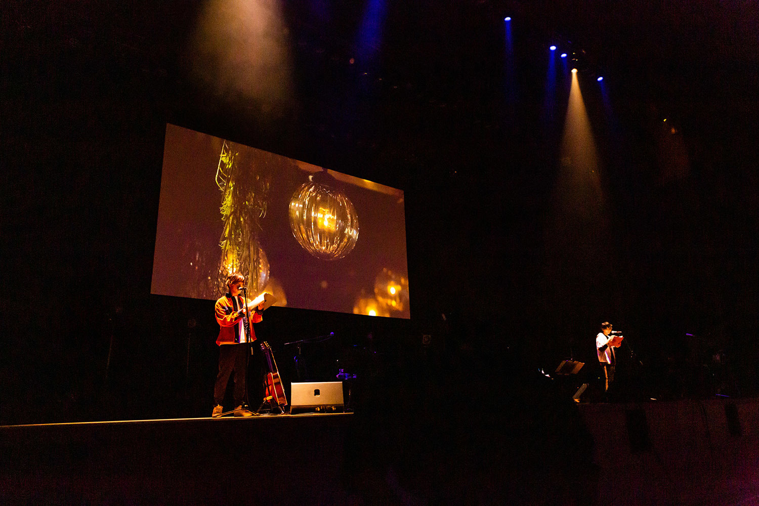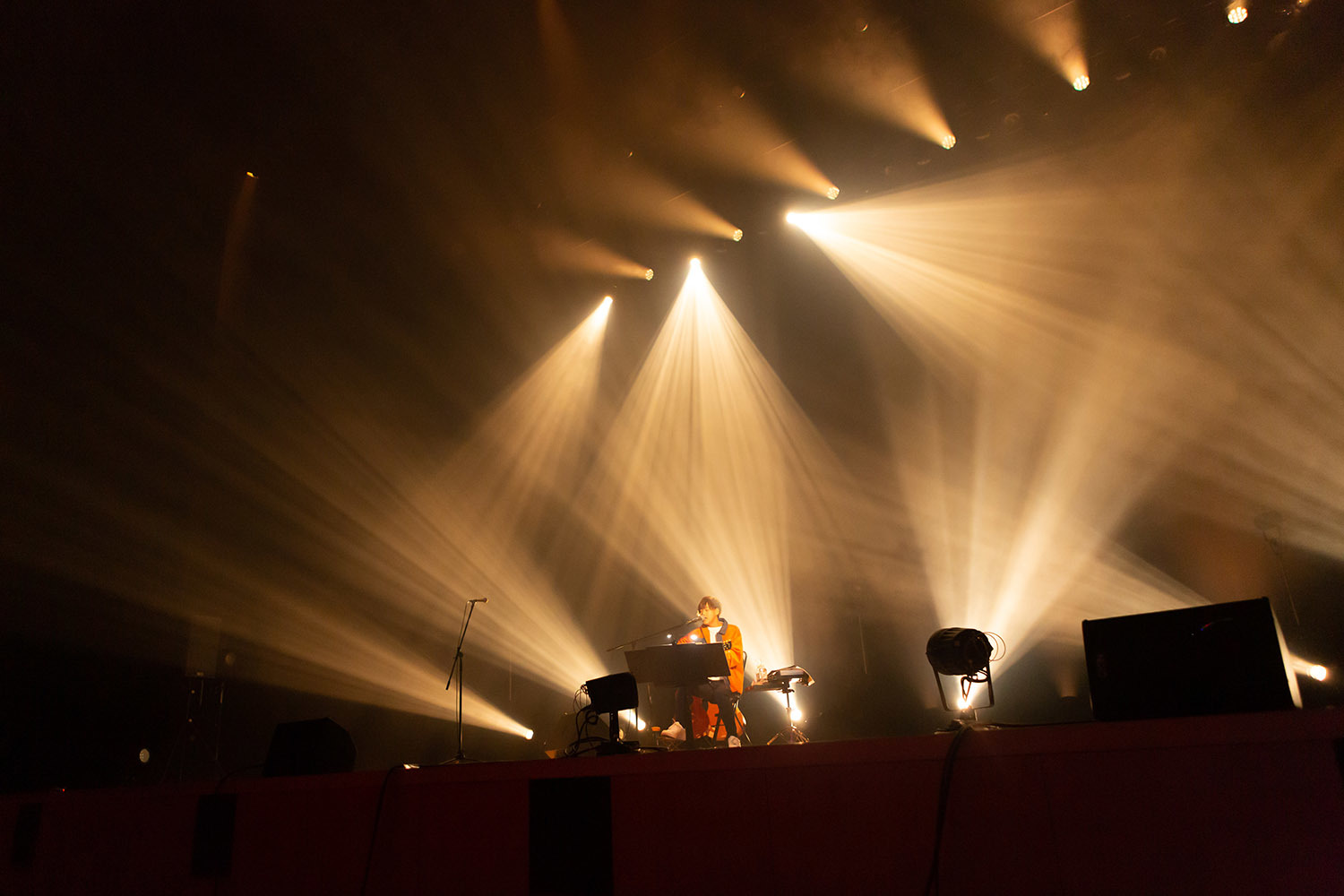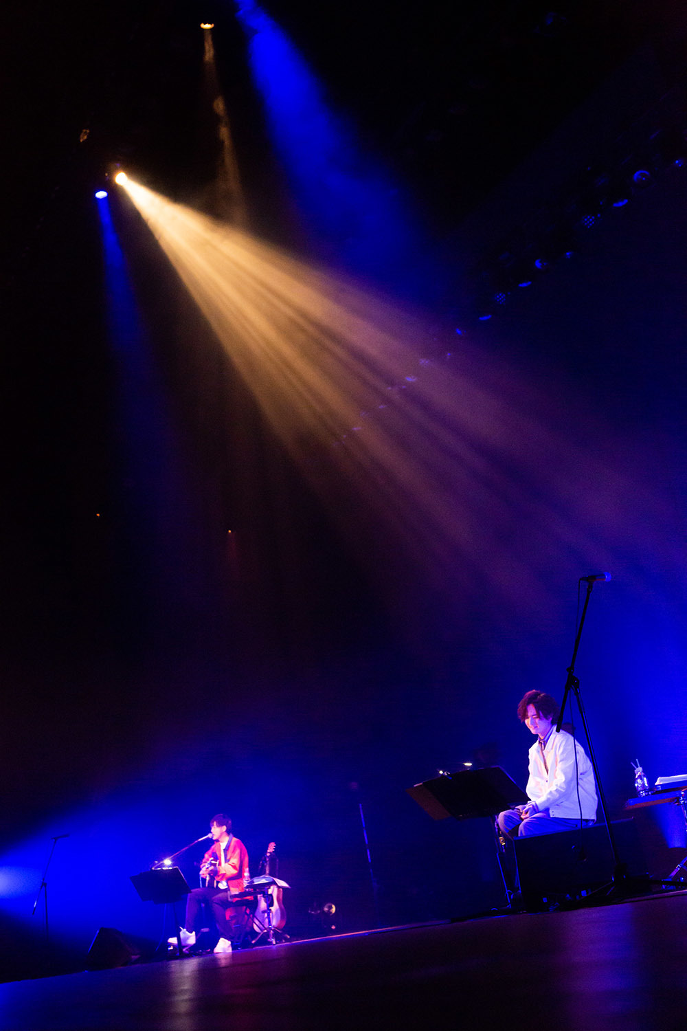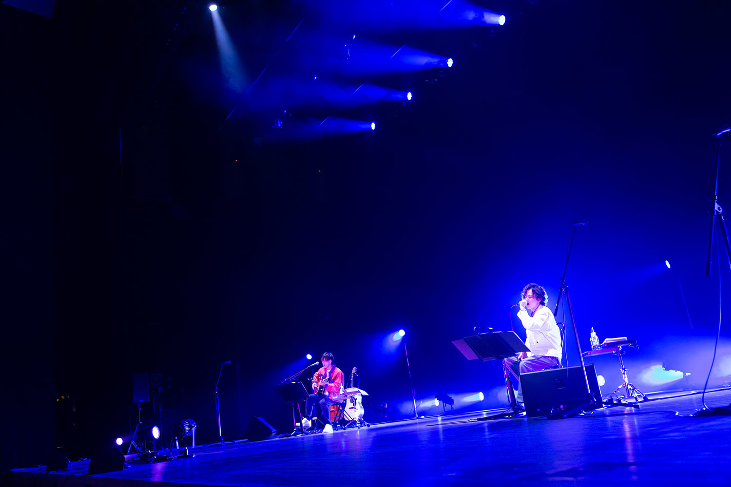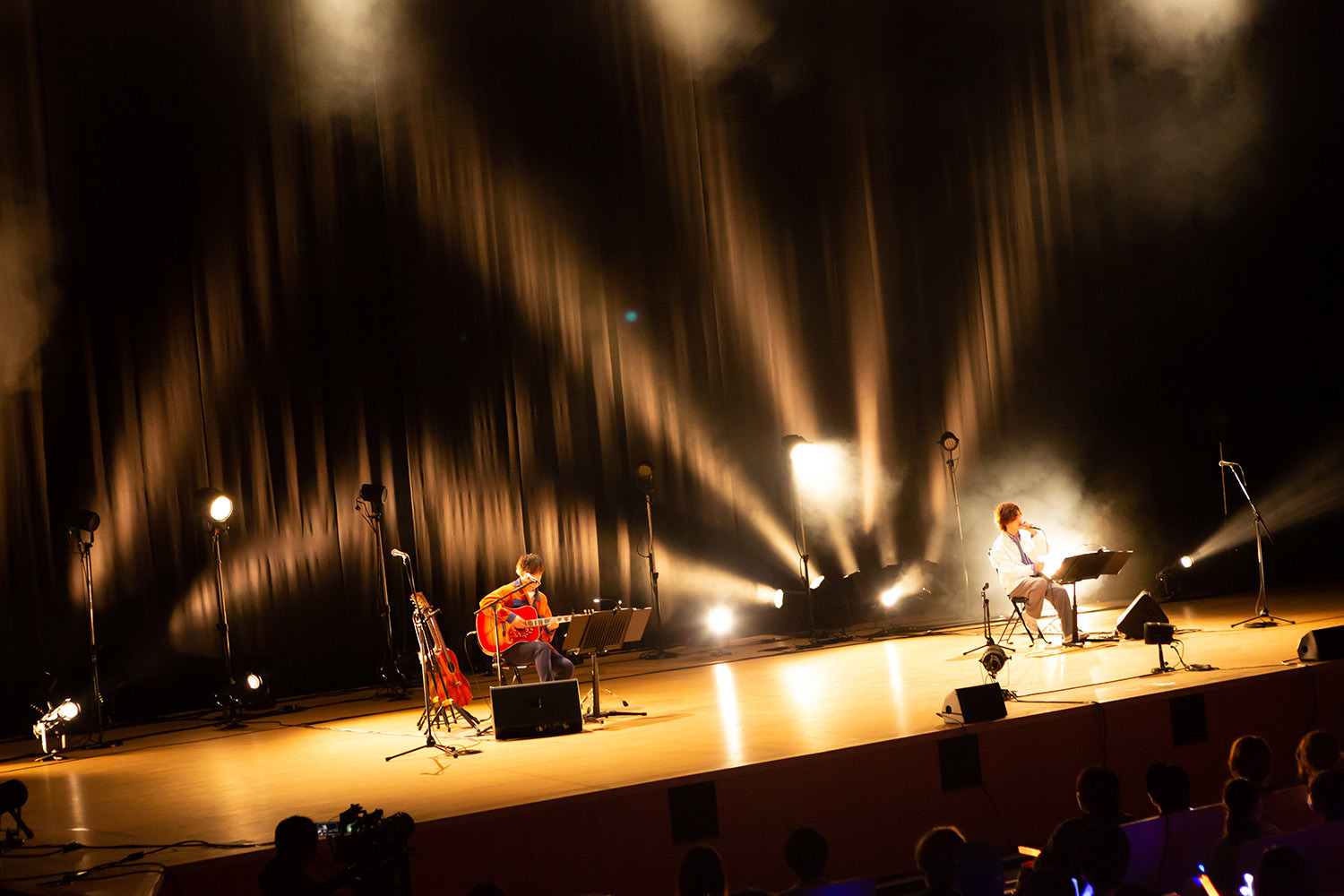 舞台が暗転すると秋谷に変わり伊藤が現れ、そんなカラオケボックスでのひとコマを思い出させる選曲の「超夢宙閃隊<スターファイブ>より愛を込めて」と「ゴールライン」を2曲続けて披露。ギター1本と2人の歌声だけで作り上げてきたこのツアー、舞台上にも華美な装飾は一切なく、2人を照らし出すバックライトと譜面台、そして2人が腰掛けるスツールくらいしかないシンプルなステージだが、それがまた2人が発する声や音によりフォーカスさせる演出となっていたのも事実だ。
