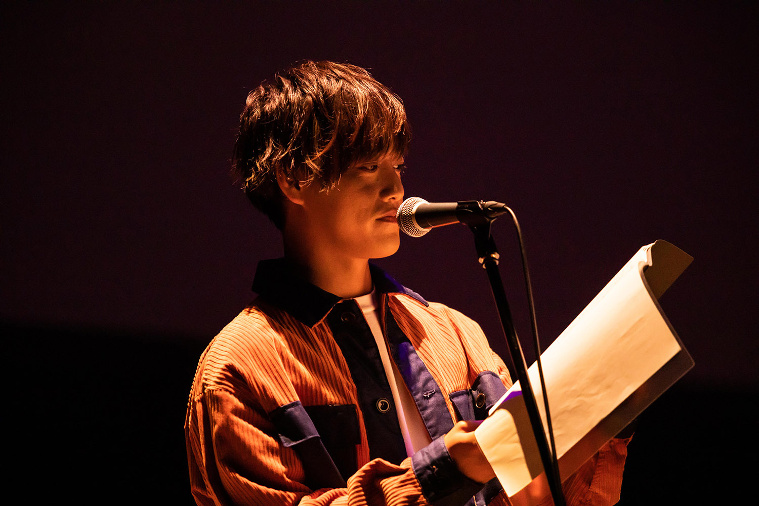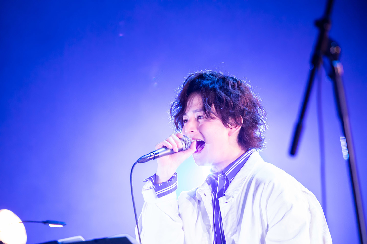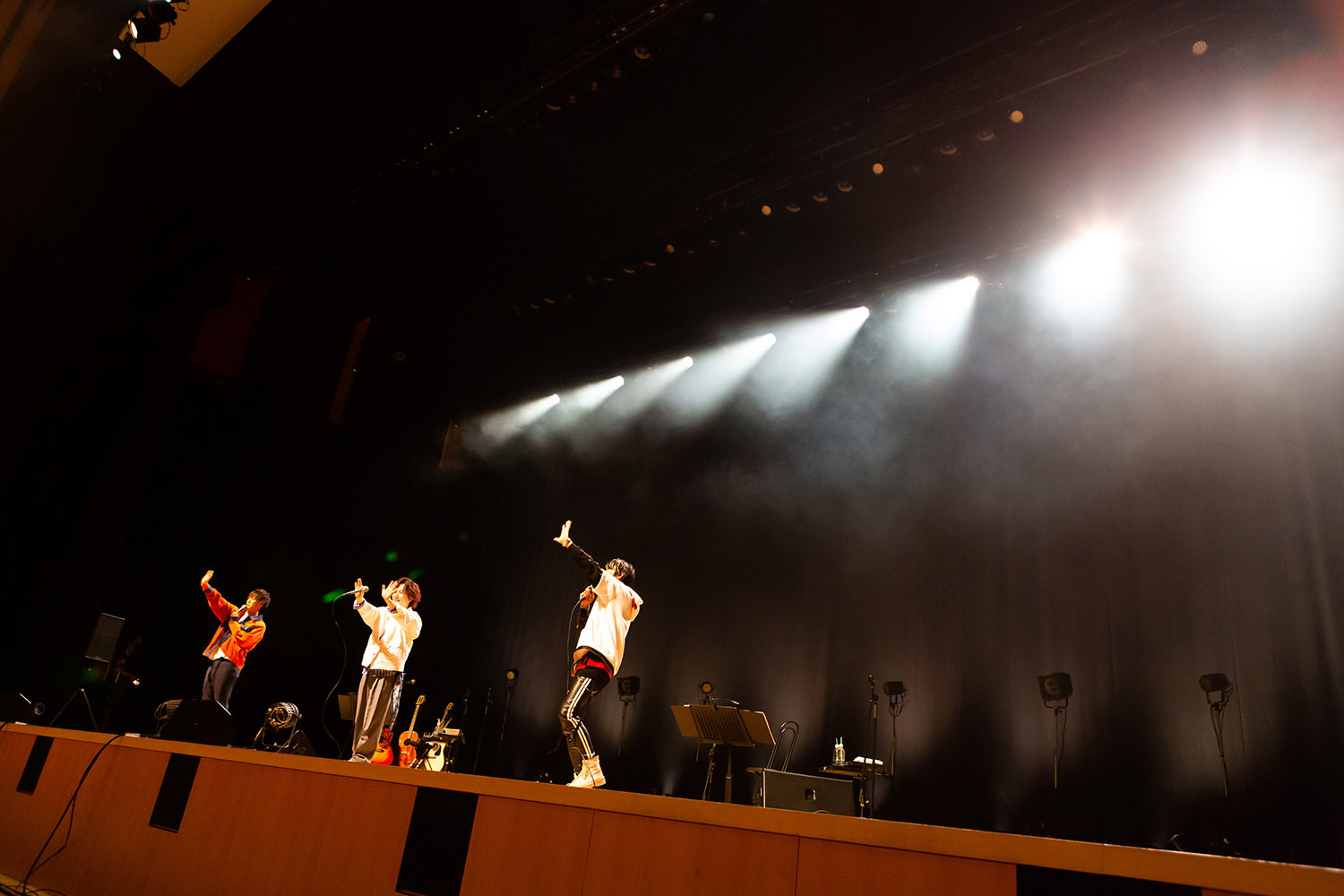 3曲目の「流星雨」も当然アコースティックverで演奏される。原曲とは異なり、優しく歌い上げていくその様は、まるで涼のおっとりとした語り口のようにも聞こえてくるし、そんな2人の会話と結人の想いを改めて確認した直後に聞くと、その歌詞がダイレクトに心に刺さる。続く「STARTING OVER」ではホット&クールに歌い上げ、また照明に応じるように場内のペンライトも青と赤を交互に繰り返す。「As Is あるがままで」は臆病な自分と戦い続け、その結果あるがままを恐れないという結人そのものだし、結人のソロ弾き語りで披露された「Shining Rain」では即座にオレンジのペンライトで埋め尽くされた。