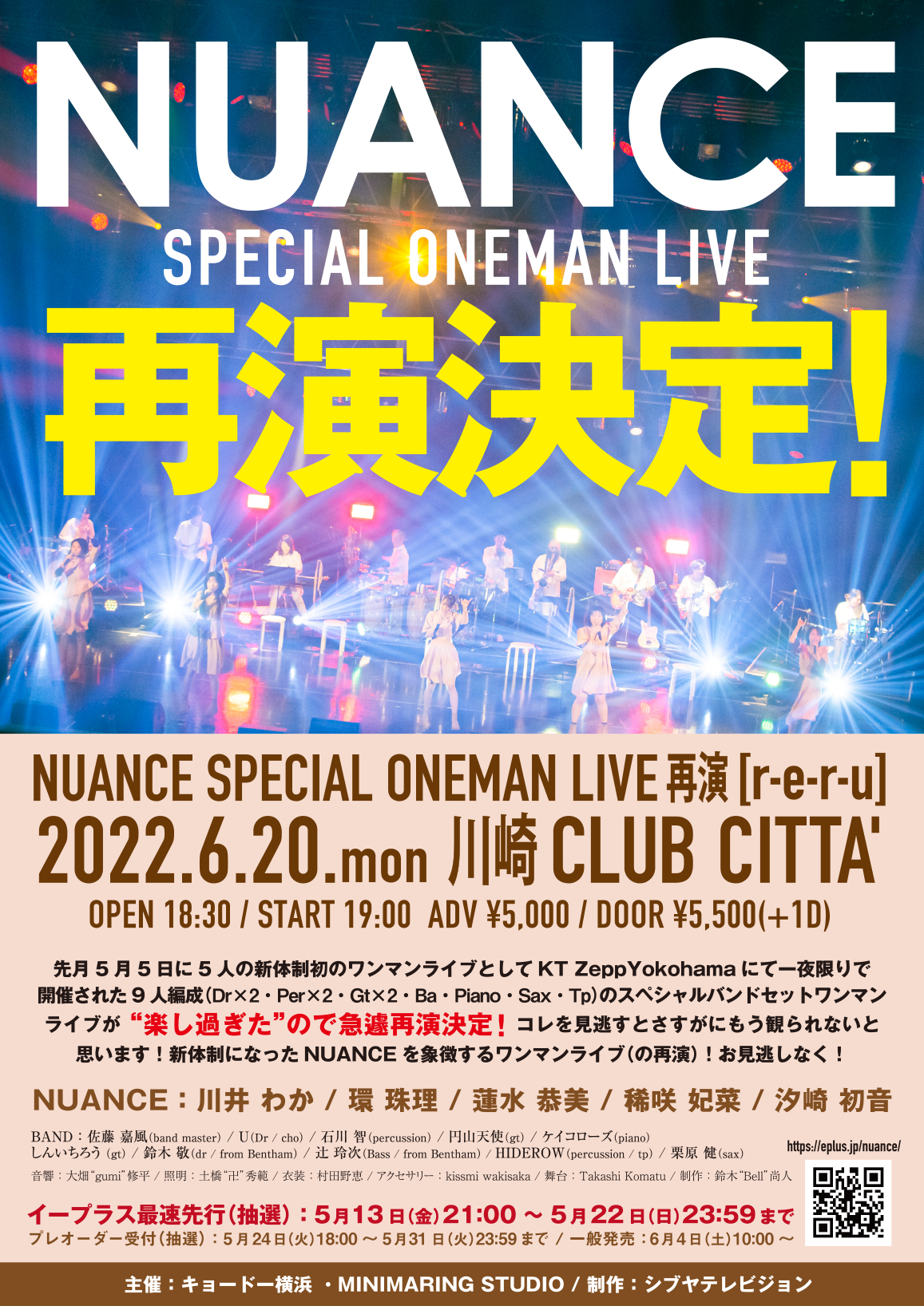 新体制になったNUANCEを象徴するワンマンライブ(の再演)をお見逃しなく。また、7月13日(水)には新体制の5人でReRECした初のフルアルバム『NUSEUM(ヌュージアム)』をリリースする。