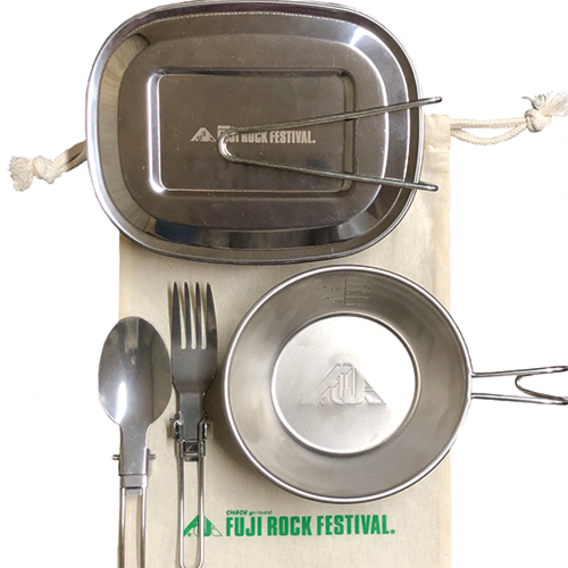 初登場グッズの中で目を引くのがこちら。キャンプで過ごす人が全体の大部分を占めるフジロックらしい一品です。メスティン、シェラカップともに山ロゴ入りなのが最大のユニークポイント。収納袋がついてくるのは便利ですよね。メスティンと折り畳み式のスプーン&フォーク、シェラカップ、それぞれ個別でも販売されています。フジロック期間中だけでなく、通常キャンプで気持ちをあげられるアイテムです。
