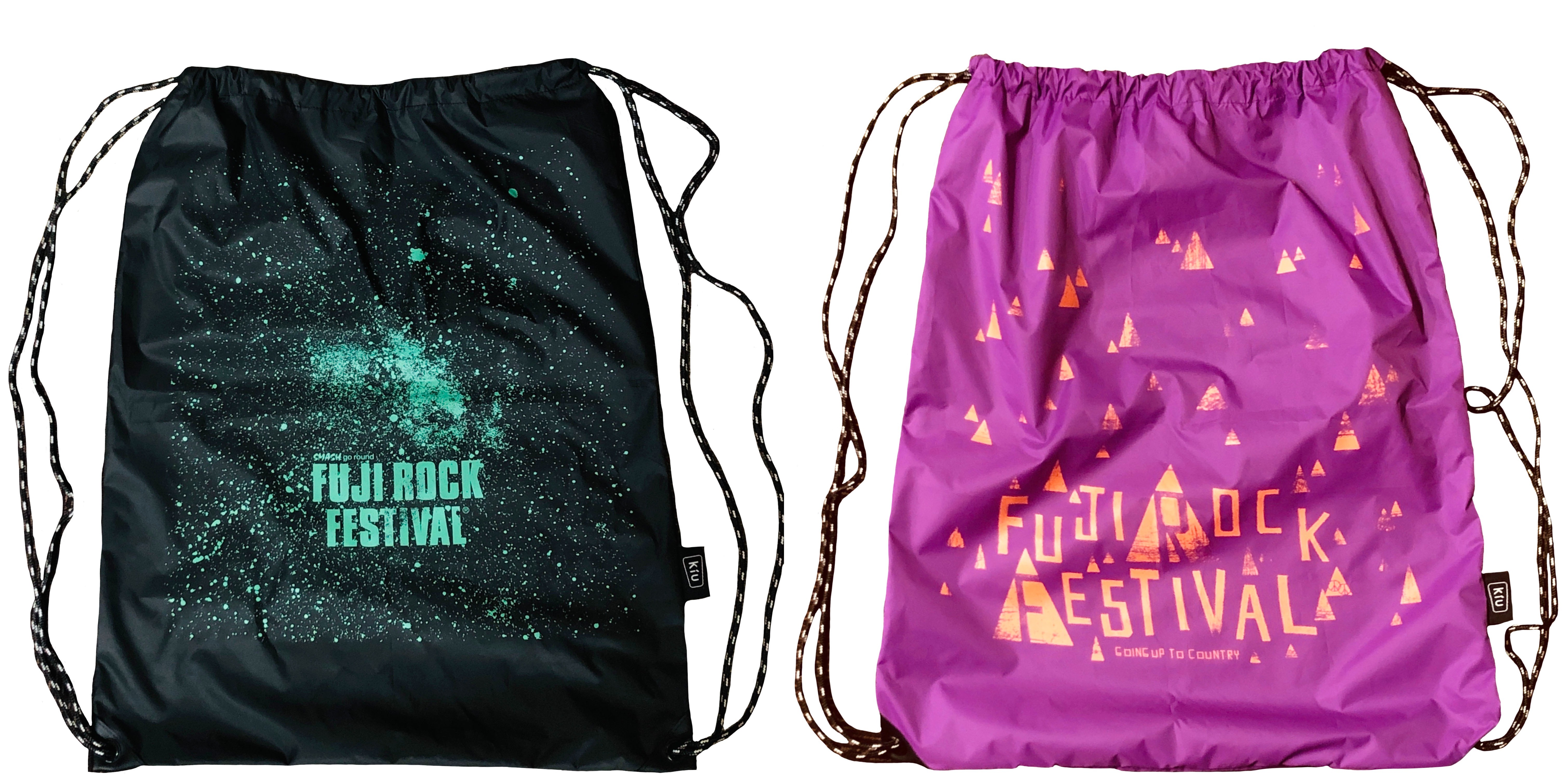 KiUのレインポンチョ素材のはっ水防水生地使用の軽量ナイロン・ナップザックは雨天のフェスやアウトドアで大活躍するアイテム。デザインはフジロックの自然風景を切り取った2種で値段も手頃。昨年初登場したものの、現地販売のみだったので手に入れられなかった人が続出したとか。今年は通販で購入できるとあって売り切れ必至でしょう。