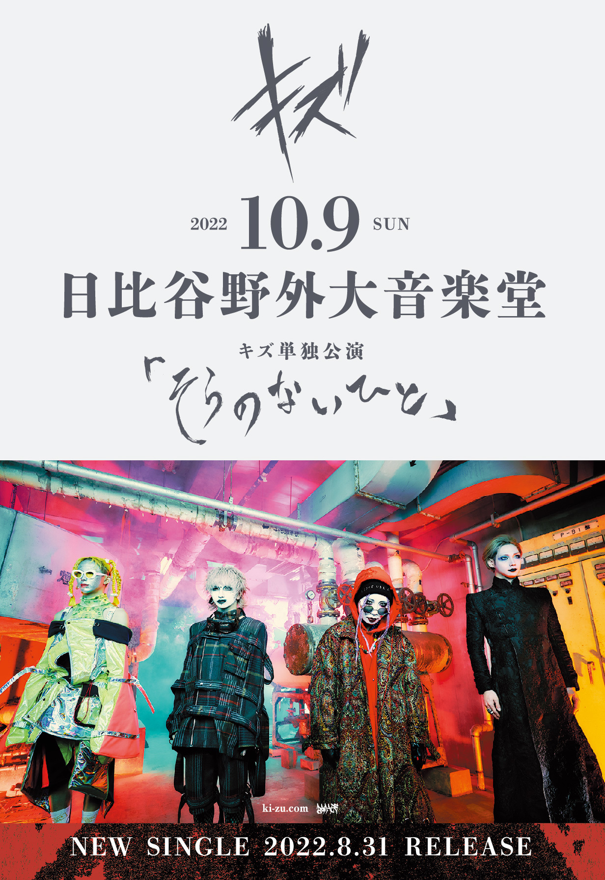 本日5月14日、日本青年館にて単独公演『天獄』を開催したキズが、10月9日(日)に東京・日比谷野外大音楽堂にて単独公演を開催することを発表した。