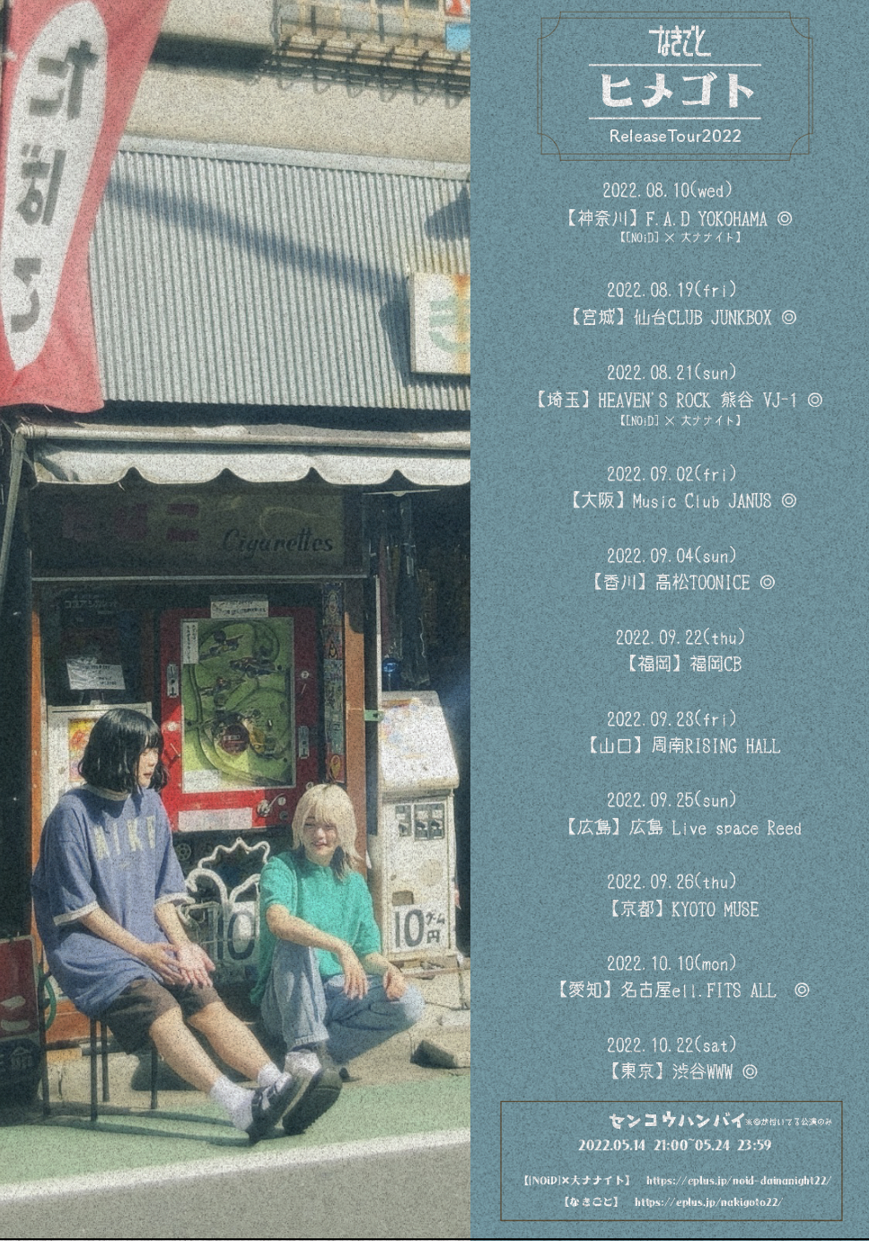 6月30日には、「Summer麺」(読み:サマーヌードル)。7月22日には、「自転車」をリリースする。上記2曲と新曲1曲のアコースティックver.が収録された会場限定盤『ヒメゴト』のリリースも決定。なきごととしては最長となる全国ツアー、『なきごと「ヒメゴト」Release Tour 2022』を行い、初日のF.A.D YOKOHAMAからツアーファイナルとなる渋谷WWWまで、全11箇所をまわる。