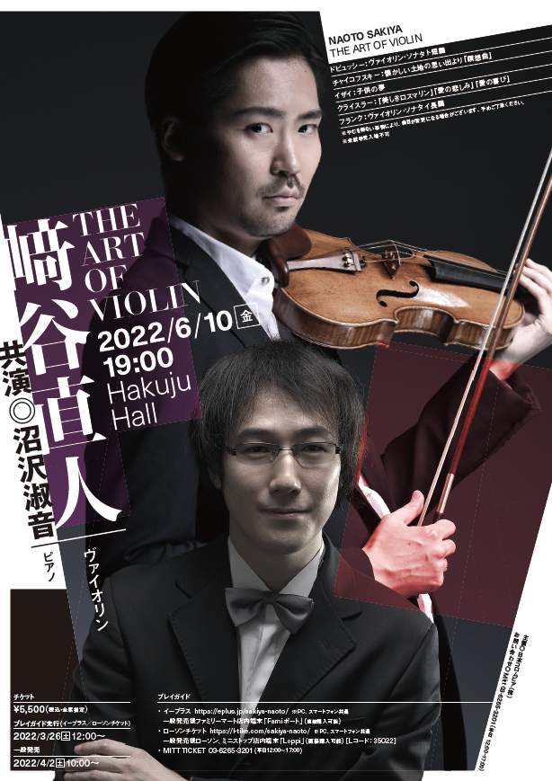 ヴァイオリニストの﨑谷直人が2022年6月10日(金)にHakuju Hallでピアニストの沼沢淑音とリサイタルをひらく。ウェールズ弦楽四重奏団や石田泰尚とのユニット“DOS DEL FIDDLES”のメンバーとしても活躍する﨑谷は、この3月に8年間務めた神奈川フィルハーモニー管弦楽団のコンサートマスターを退任し、いよいよ新たな活動を本格化する。