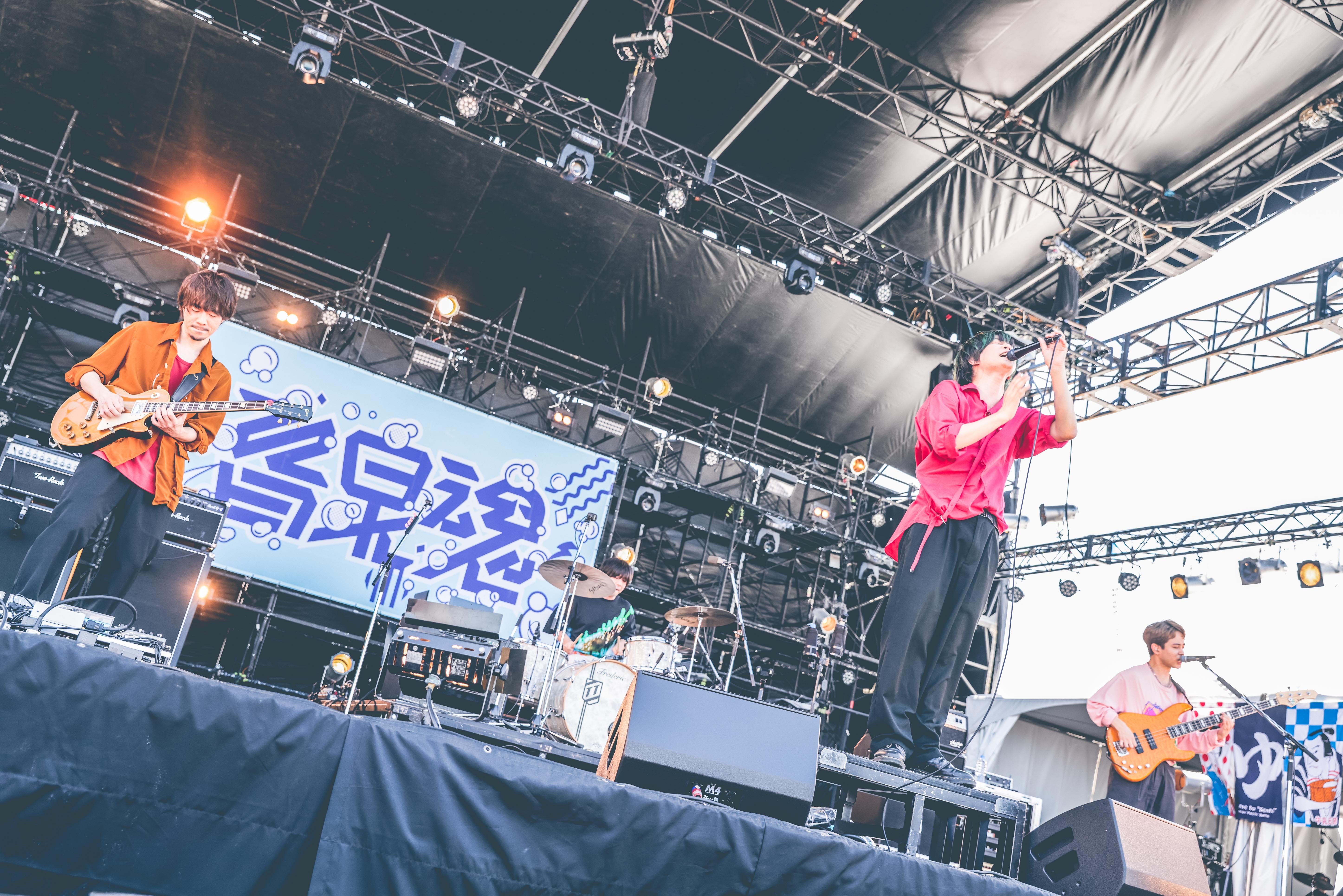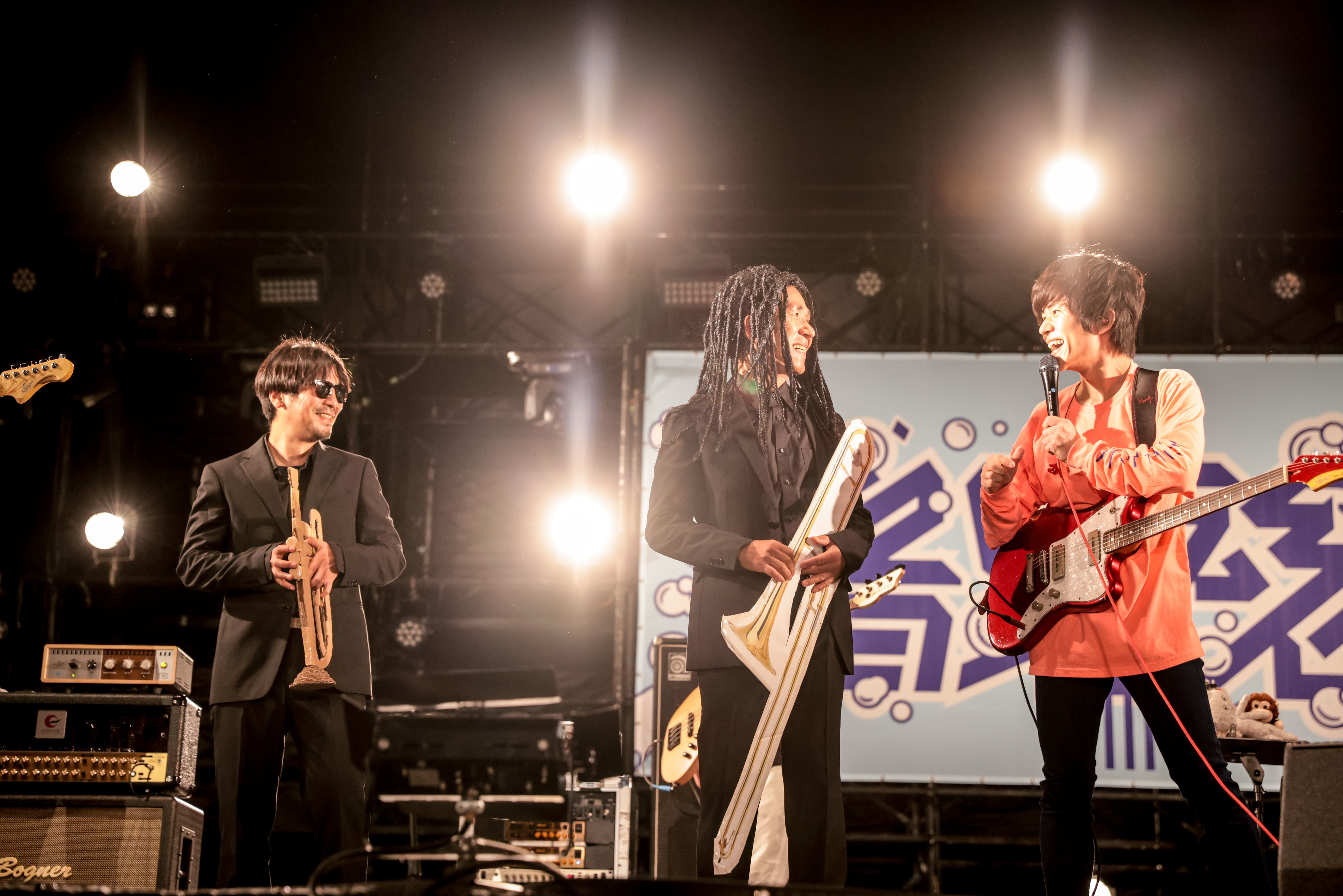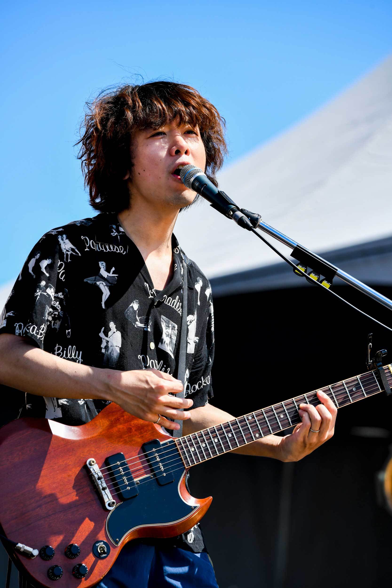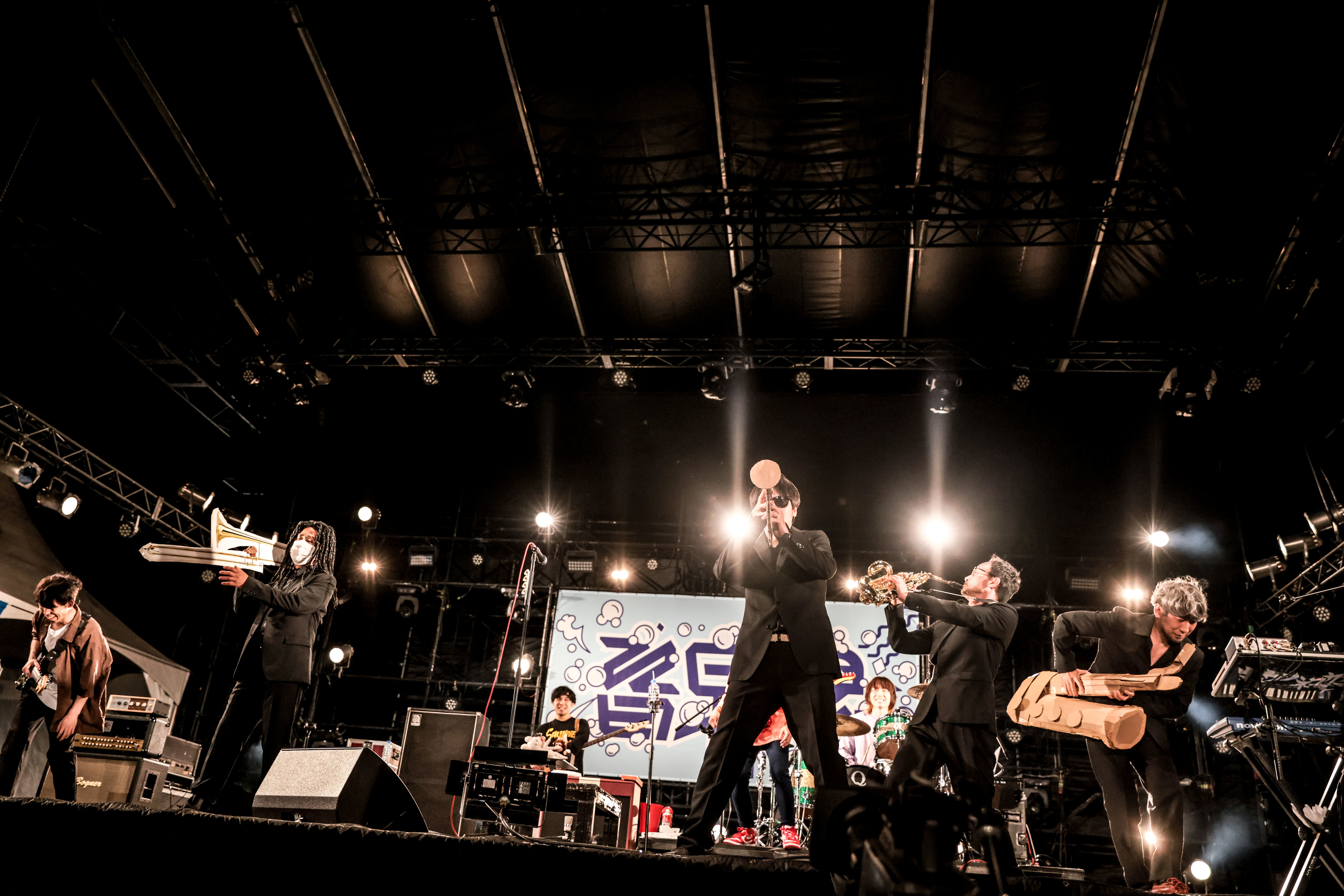 とも口にした大澤会長は、ちょっと前に作ったが音源リリースはしていない新曲「地味な生活」を、「このフェスに合わせたと思わせる歌詞がある、そう思ってもらってけっこうです!」と前置きしてから、プレイした。コロナ禍で地味な生活を強いられていてもうイヤだ、温泉行きたい旅行に行きたい、という歌詞を変え、<OTODAMA行きたい OTODAMA行きたい OTODAMA行きたい まあ来たけどね>と連呼する、この日のためだけの特別バージョン。無論、大ウケ。