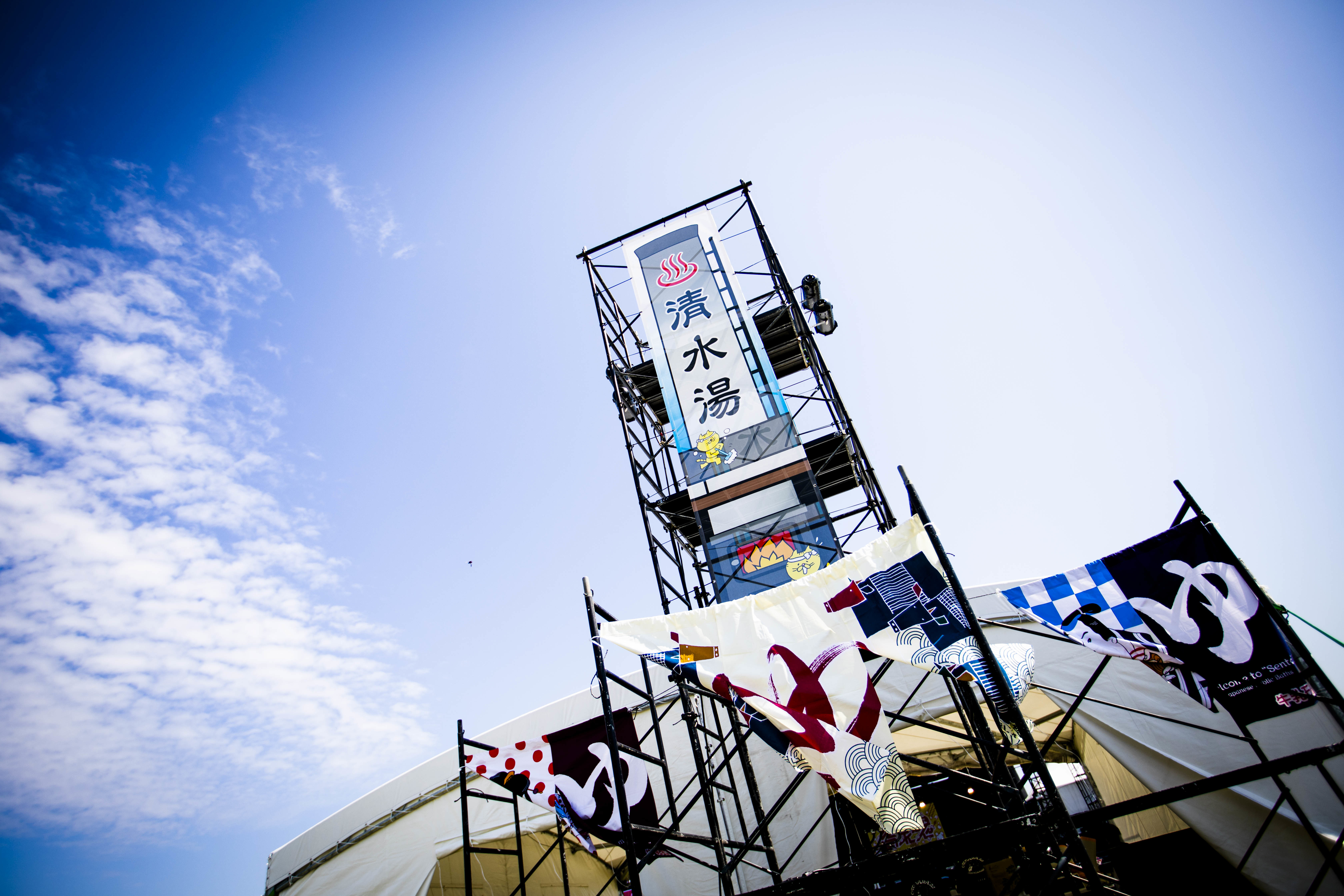 大浴場ステージと露天風呂ステージを同じ大きさにした、大小をつけなかった、というのが今年の『OTODAMA』の特色のひとつだが、そのふたつのステージは、前回までの並行に設置される形ではなく、90度になっている。東西南北で言うと、南の端に大浴場ステージがあって、東の端に露天風呂ステージがある、という形。で、ステージのサイズは一緒だけど、会場自体の奥行きとしては、大浴場ステージの方が幾分か広い。
