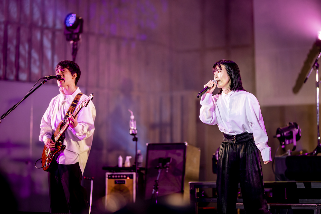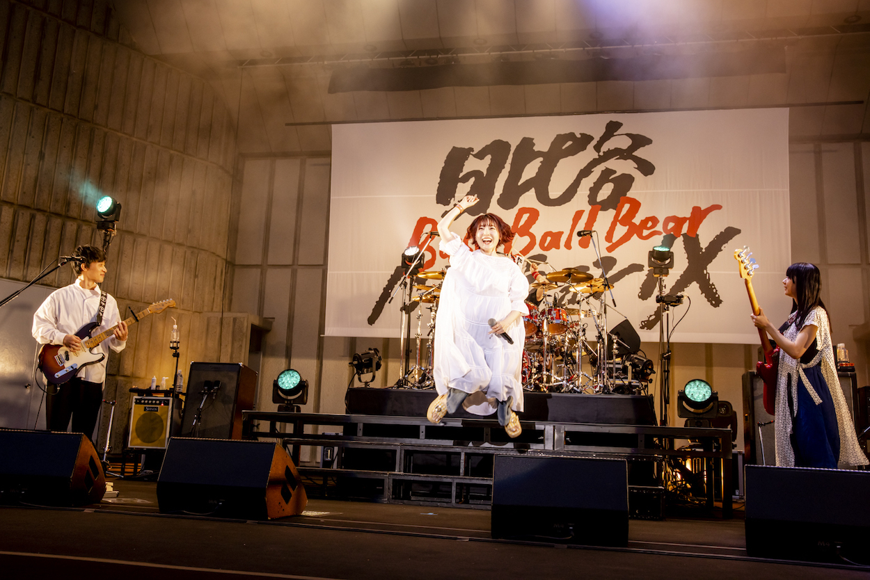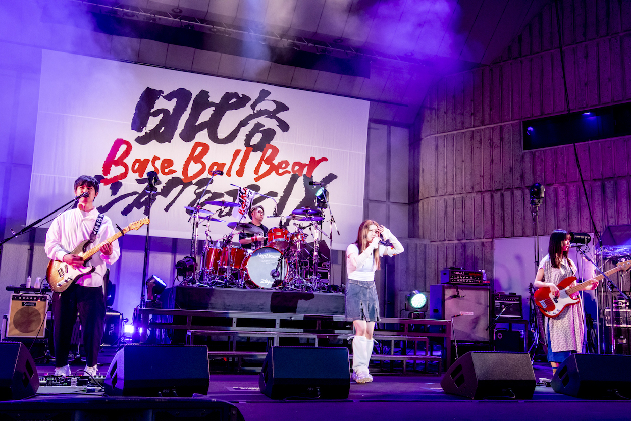 さらに『日比谷ノンフィクション』ならではの特別な祝祭感が色濃く形作られていったのが、本編終盤に訪れた客演セクションだった。意外にもライブではこれが初共演となった花澤香菜との「恋する感覚」はあまりに爽やかで、最新アルバム『DIARY KEY』において唯一の客演曲であるvalkneeとの「生活PRISM」は陽性のパーティー性もありながら日比谷の官庁街の光景もあいまって現在進行系のソーシャルイシューの陰影も離れがたく想像させ、関根がベースをチャップマンスティックに持ち替えたRyohuとの「歌ってるんだ Baby.」ではサイケデリックなサウンドスケープが現出し、そして、スケジュールの都合で駆けつけられなかった福岡晃子のインターネットの友だち=チャット友だちとして登場しオーディエンスを驚かせた橋本絵莉子とRyohuを迎えた「クチビル・ディテクティブ」は間違いなくライブにおける一回性の多幸感に満ちていた。音楽的にも、客演のメンツとしてもBase Ball Bearはずっと多様性に富んできたということを、十二分に体感できるセクションだった。